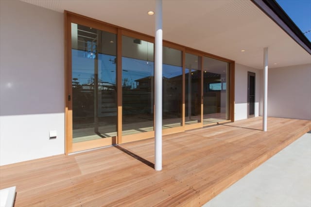 掃き出し窓をスライドさせると、ウッドデッキとリビングが一体となり、さらなる大空間に。