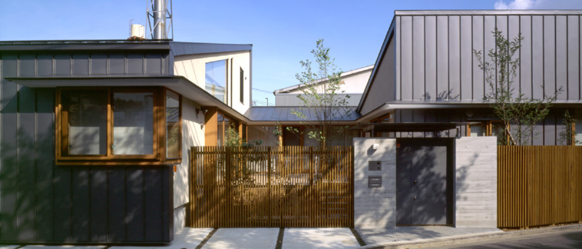 洗足流れの遊歩道からみたKさん邸。中央のウッドデッキと収納スペースで左右のKさん邸とお母様邸がつながる。木製の竪格子が視線を遮りつつ風通しを実現