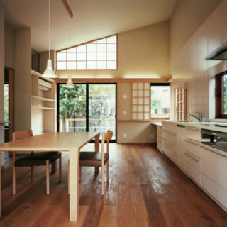 高窓に障子をあしらうことで、陽光を優しく取り込むと共に和テイストにも 開口部の障子は壁の中に収納されている