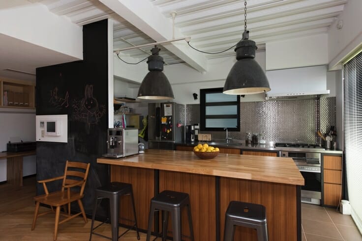 シンク・コンロの前に貼ったタイルは珍しいステンレス製。インダストリアルなデザインを追求し、奥さまが探し出したもの。