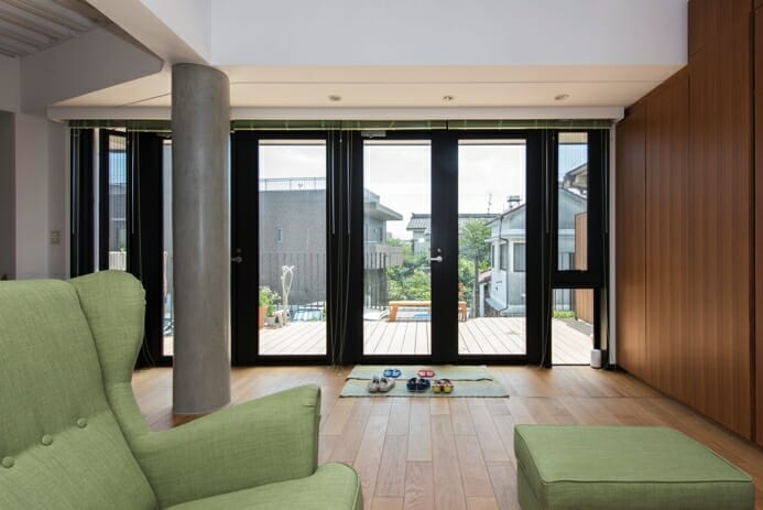 テラス側にはほぼ壁を設けず、ワイドサッシを採用。室内と室外の境界があいまいになり、互いの空間がさらに広く感じられる。