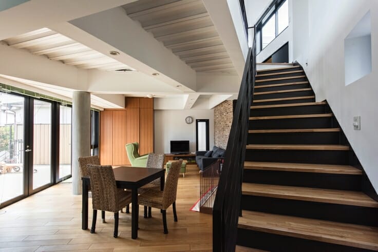 ラフに貼られた壁面の古レンガ、キッチンに吊るしたヴィンテージの照明、鉄骨の構造体をいかした天井や階段など、日本の一般的な新築住宅とは一線を画すA邸。この個性的なインテリアがうまれは背景には、アメリカで出会ったご夫妻ならではの価値観がありました