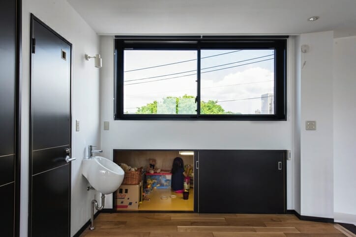 窓の下の収納は奥行き1,4m、高さ0,8~1,0mと屋根裏部屋のような大空間。収納スペースとしてはもちろん、子どもたちの格好の遊び場にもなっている。