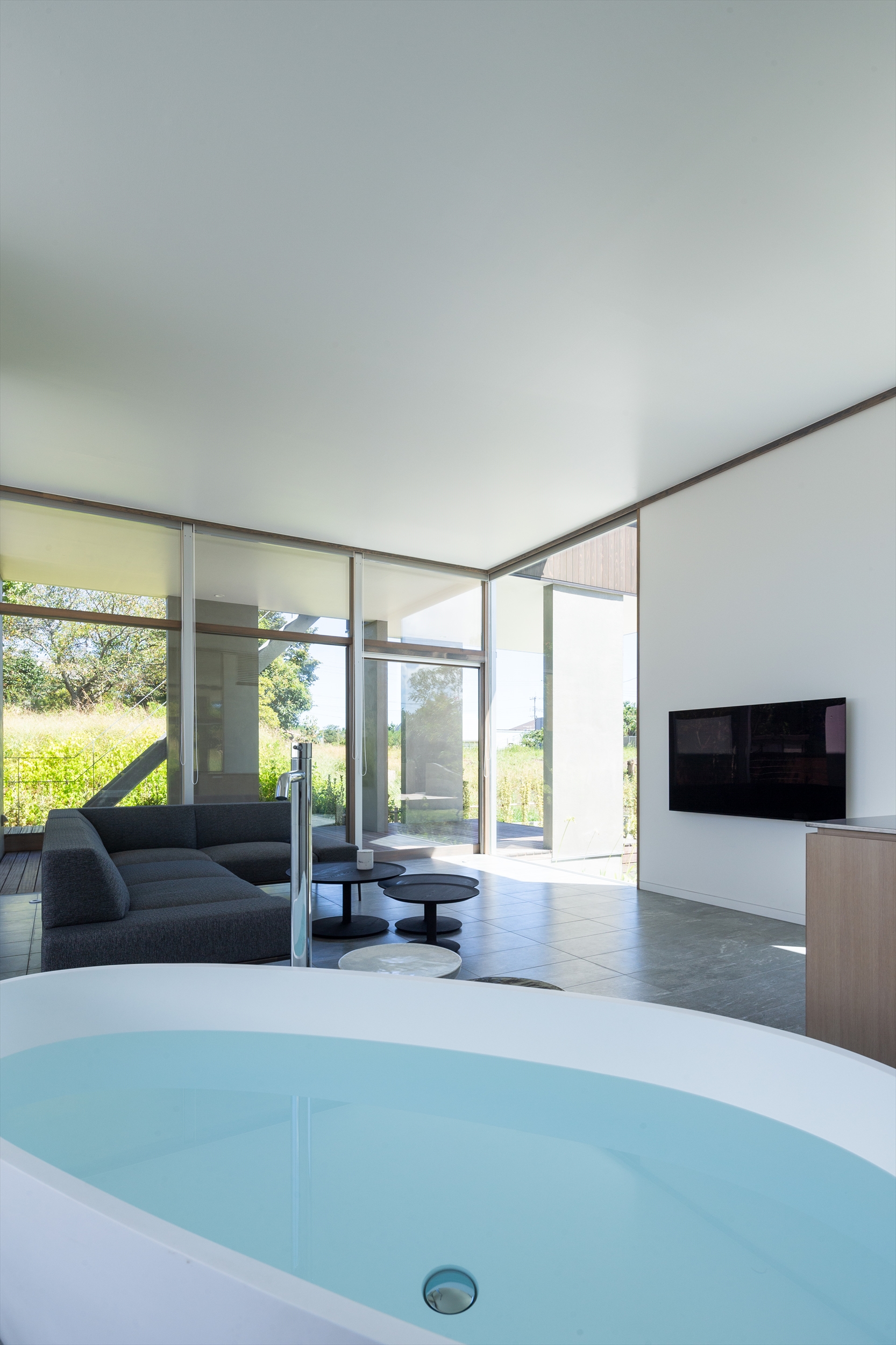 三方に大きく取られた窓からは太陽の光が降り注ぎ、明るく開放的な空間。テレビやミニキッチンもあるこの部屋には、ソファーやテーブル、スツールなど品の良い家具とともに、透き通るような白さと柔らかなフォルムが美しい浴槽が置かれている。リビングにお風呂を設えたのだと思うのも無理はないが、実はこの部屋はバスルームなのだ。