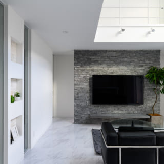 1階吹き抜け、リビング。建物をコの字型に計画しデッキテラスを家の中央に設けたことで、リビングにいながら玄関の様子まで伺える。モノトーンでまとめられた室内は、高級感たっぷり。テレビの背面の壁面のみにごつごつとした質感を感じる石調パネルを配し、空間を格上げした
