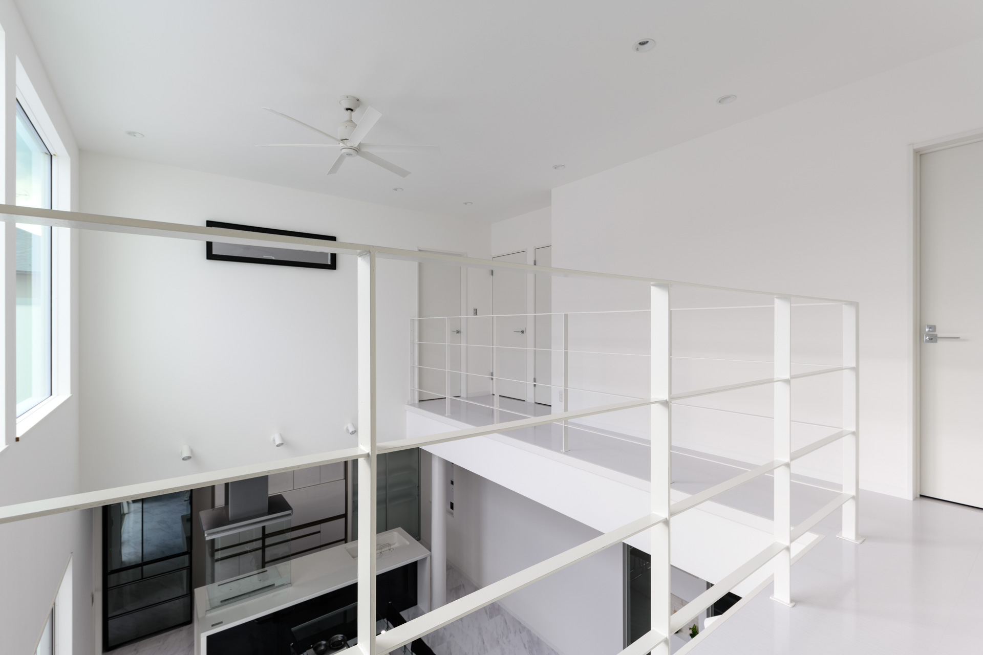 2階、東側の廊下から見たところ。1階に見えるのはキッチン。奥様の「キッチンから室内が見渡せるように」というご要望が反映されているのがわかる。写真奥、黒枠の窓は寝室の窓。「空間につながりを持たせるためにも、家の内側に向かった窓をたくさんつけました」と桑名さん