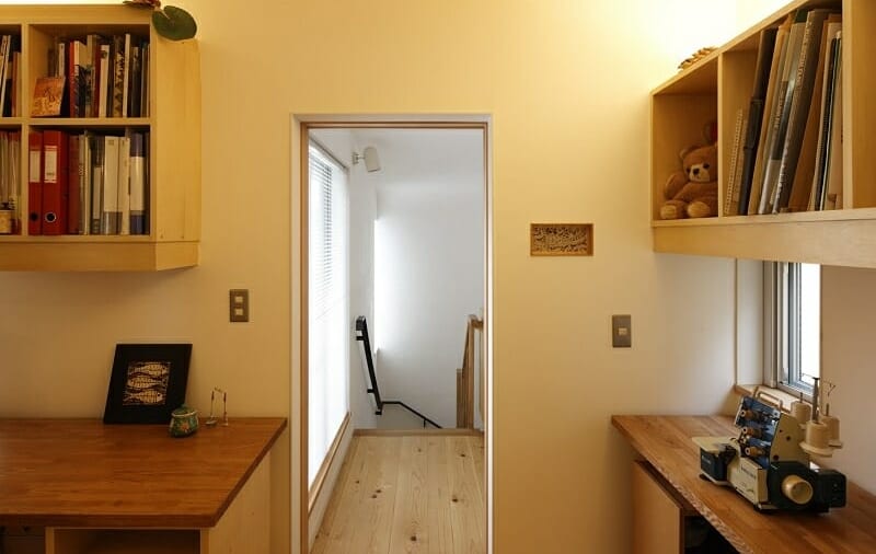 【画像】2階の娘世帯の仕事場。手前のキッチンをブラインドで隠せば、仕事の来客時も生活感を出さずに対応できる