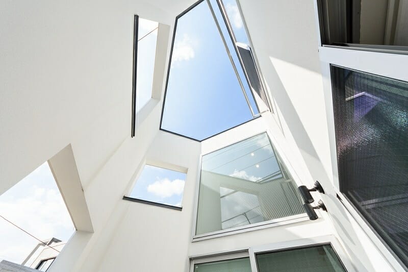 K邸の坪庭から上空を見る。小さな空間だが、道路と家を隔てながら各居室に光と風を送り込む重要な存在である