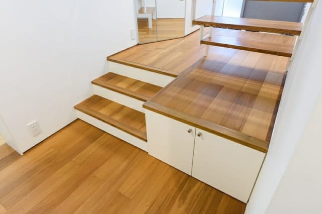 K邸の玄関を、浴室側から撮影。階段下の段差部分が、奥行きのある収納施設になっている