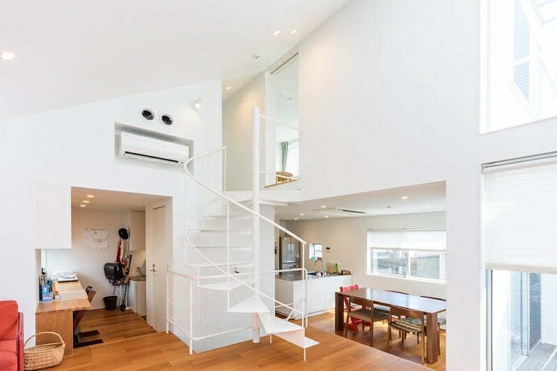 K邸のリビング。写真右奥がダイニング、左奥が書斎スペース、中央のらせん階段を上がると3階。高さ制限のため、屋根が勾配になっている