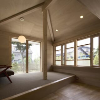 2階の小屋裏収納から下を見下ろす。成長した子どもたちが主に過ごす空間になるだろう2階は、大きな屋根でまるごと覆われる。柱や段差の間から2階全体が見渡せ、天井から屋根が感じられることで、「家の中にいる」という実感が湧くという
