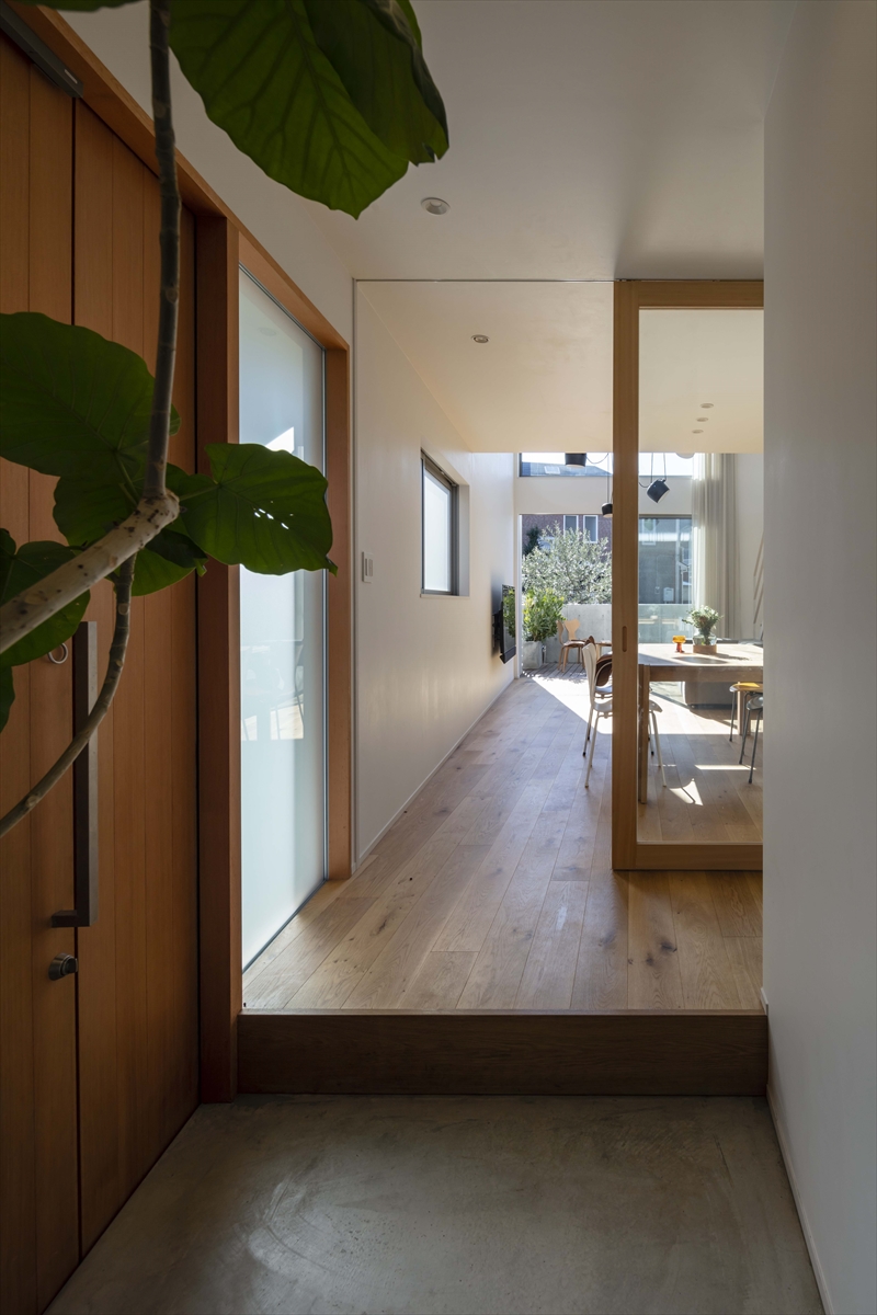 玄関からLDK。仕切りは敷居のない吊り戸とし、一続きの空間にした。LDKを抜けて外まで見通せる