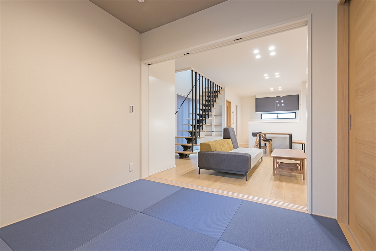 客間としても使用される和室の畳は、ご主人お気に入りのブルーカラーで落ち着きある空間に。リビングの脇に子供が遊んだり、ごろりと横になれる和室は、何かと重宝する存在
