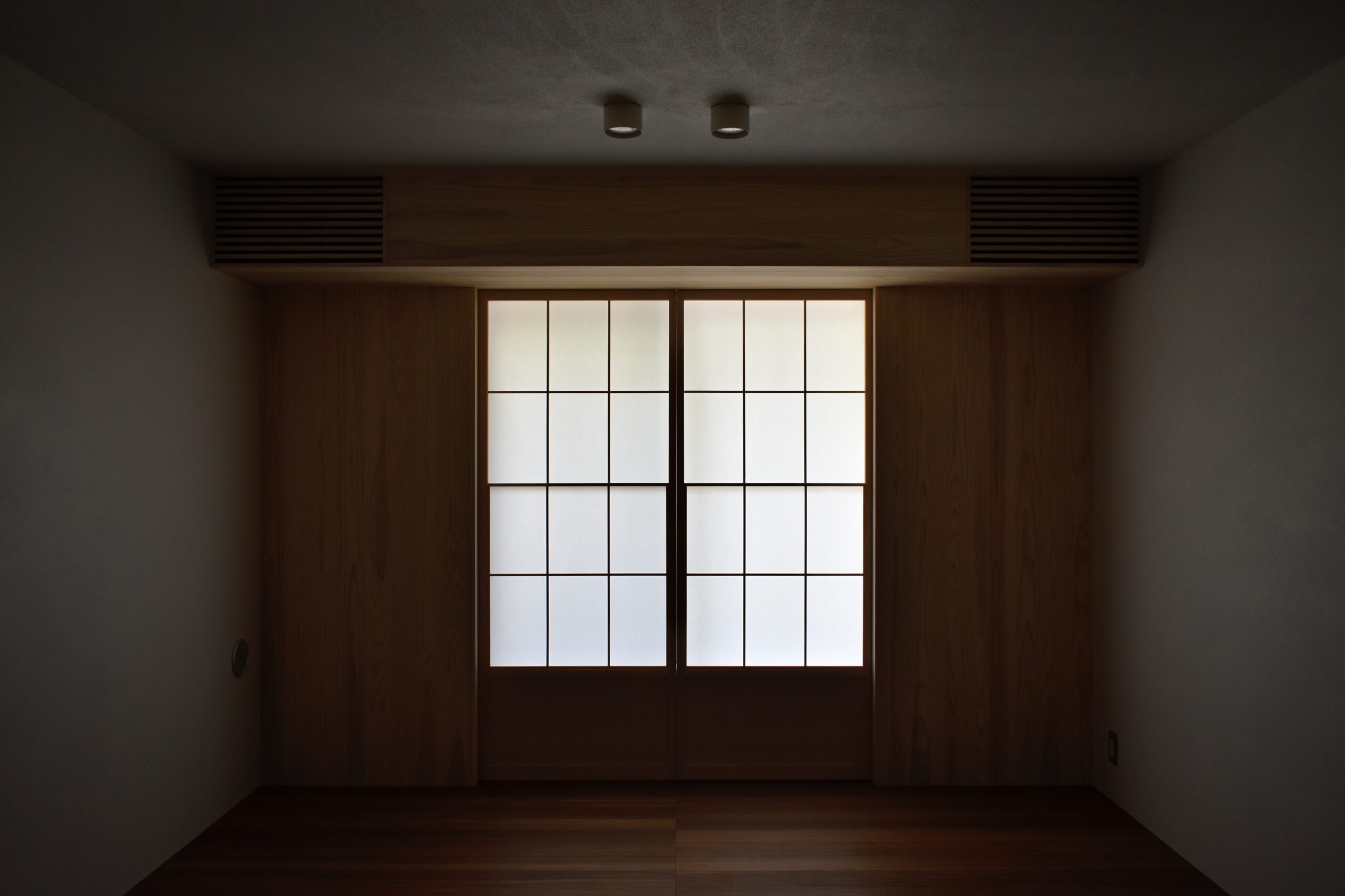 寝室の反対側には雪見障子を使用しており、ここからも柔らかな光が入るよう工夫。上部には空調の木製ガラリがはめ込まれている