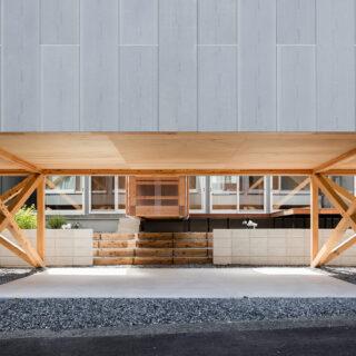 道路から中庭がちらりと見える、絶妙な高さで持ち上げられた道路側の棟。現在は植栽も大きく育ち、通る人の目を楽しませている。筋交いはプレートに同材料のカバーを付けるなど金属が極力見えないように計画。今後のメンテナンスも楽になるとのこと