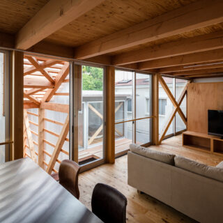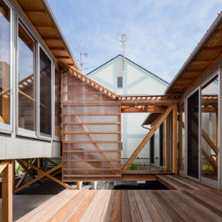 最寄駅からは少し離れた、昔ながらの住宅地の一角。高低差のある敷地に家を建てる依頼を受けた建築家の北野さんと八木さん。提案したのは家を2棟に分けるプランだ。しかも片方は建物を持ち上げ、中庭の緑を町の人たちにおすそ分け。周りの景観を壊さずに、若い家族が住むにふさわしい家ができた。
