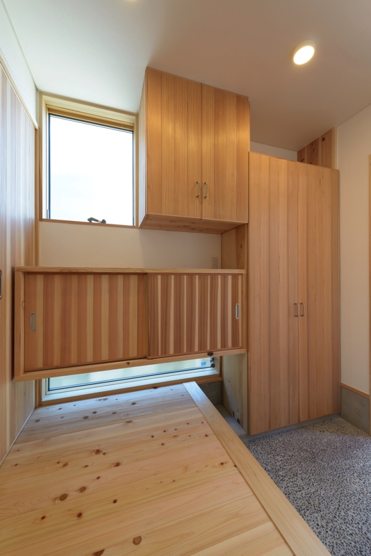 1階 玄関/すっきりとした玄関ホール。靴箱は風を通すために上下の空間をあけている。土間は表面が乾く前に水洗いして小石を浮き出させた“洗い出し”で、空間の表情に柔らかさをプラス