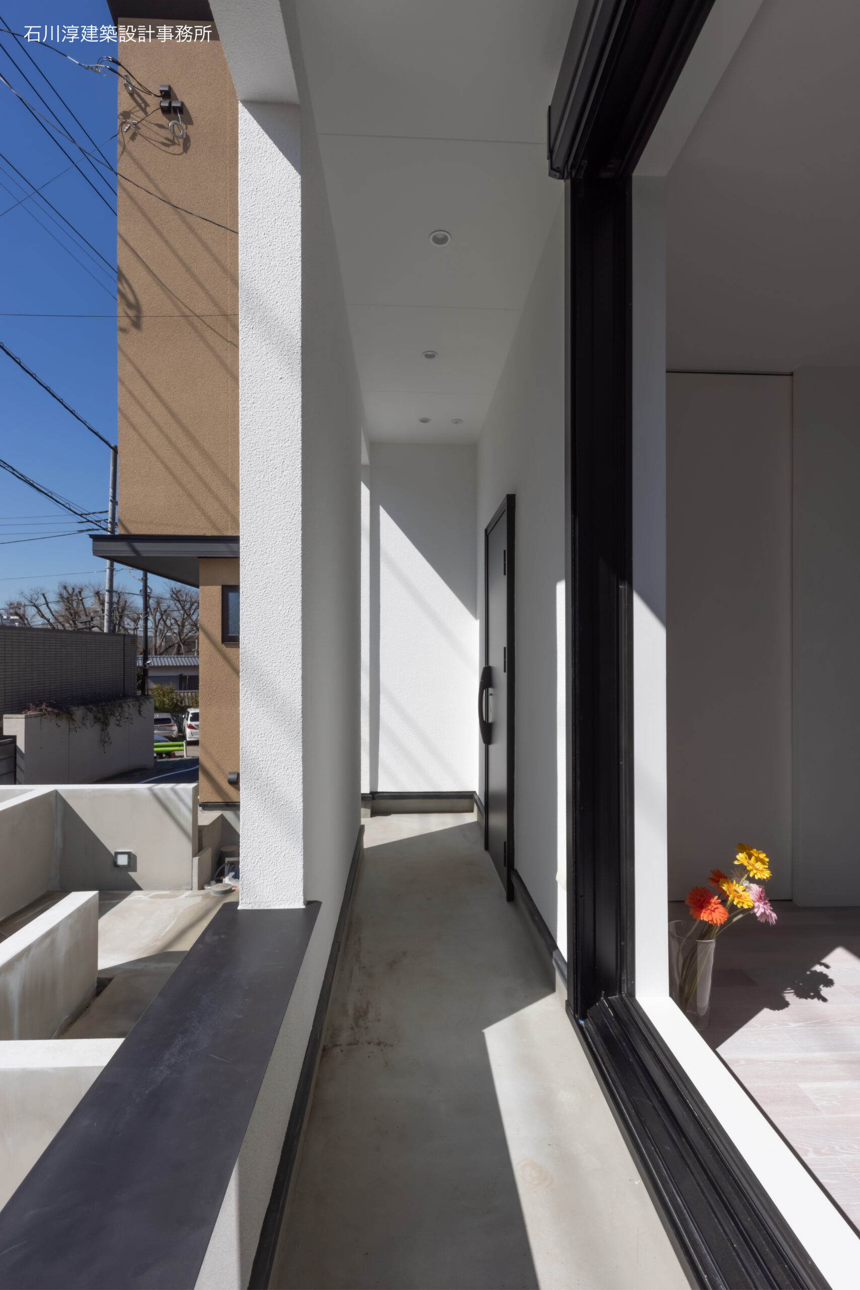 玄関前には屋外と屋内の「中間領域」が存在。前方の壁が、すっきりとしたファサードのデザインに寄与しているほか、玄関やサッシが目隠しとなり、プライバシーを守る。