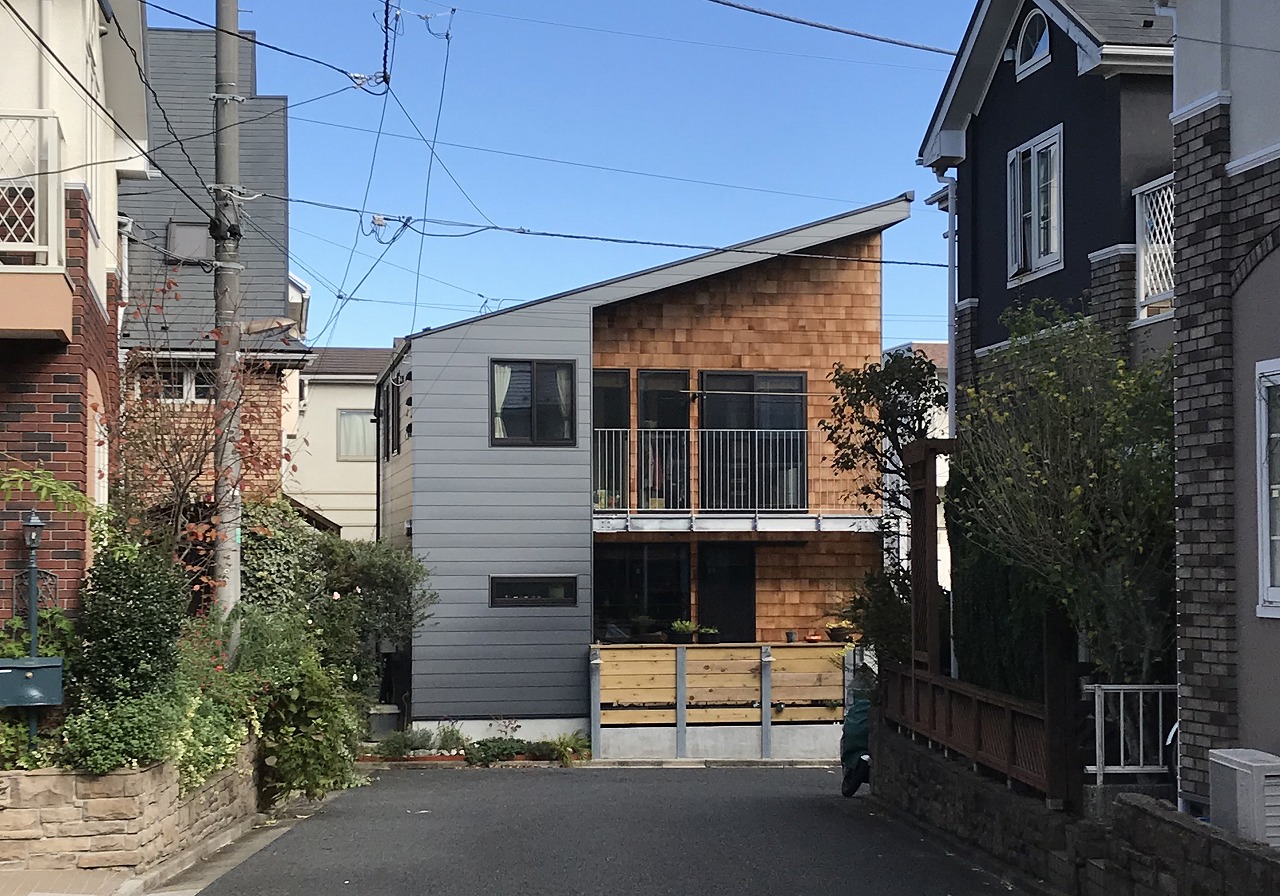 立地は、坂道をのぼった高台の住宅地。建物の高さの規制に合わせて北西(写真奥)の屋根をぐっと下げた結果、坂を見下ろす南東(写真手前)はスッと立ち上がったのびやかなデザインとなった