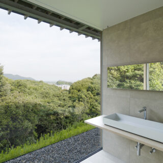 2階、ルーフテラスでは大自然を満喫できる。山の頂上に位置し、かつ2階にあるため視線が遮られることなく、島までゆったりと見渡せる。画像右の室内はルーフラウンジ。こちらもガラス張りで計画し、まるで屋外にいるような気分で絶景を享受できるようにした