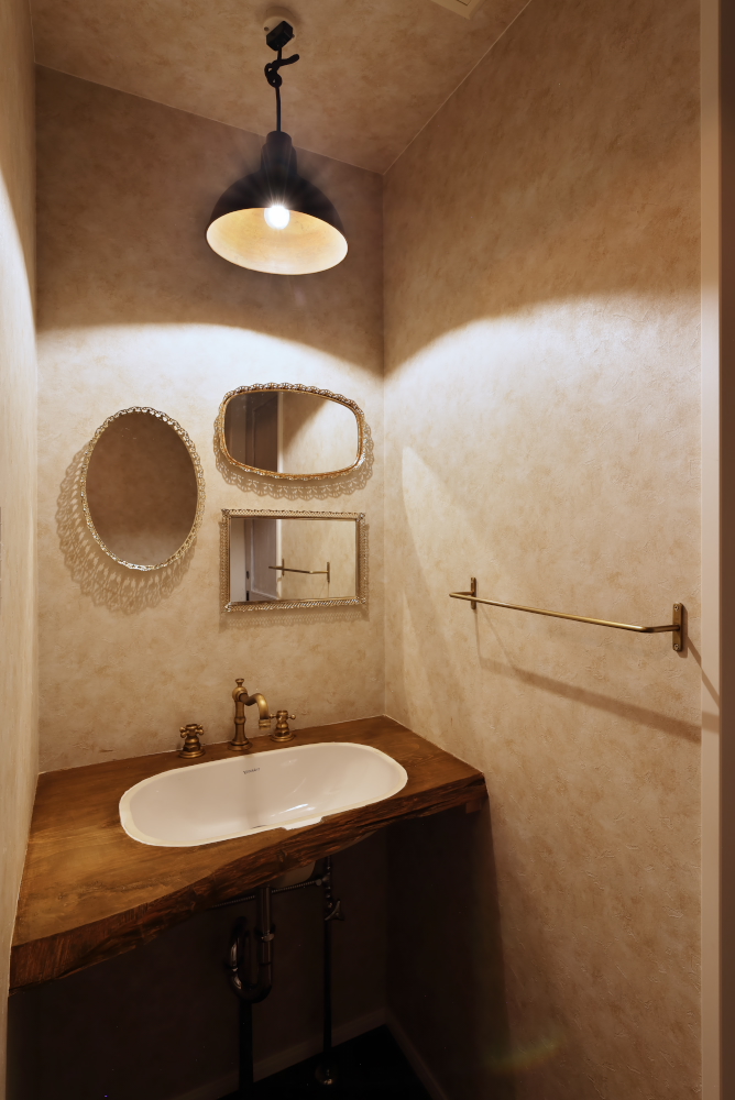 住宅2階、キッチンからダイニングを見る。ダイニングの奥、トイレの仕切り壁はレンガを使用。イギリスなどで使用されたリサイクル品であり、重ねられた時間の重みも感じられる。また、梁や柱に使用した杉材は、室内の雰囲気に合わせて自身で加工した