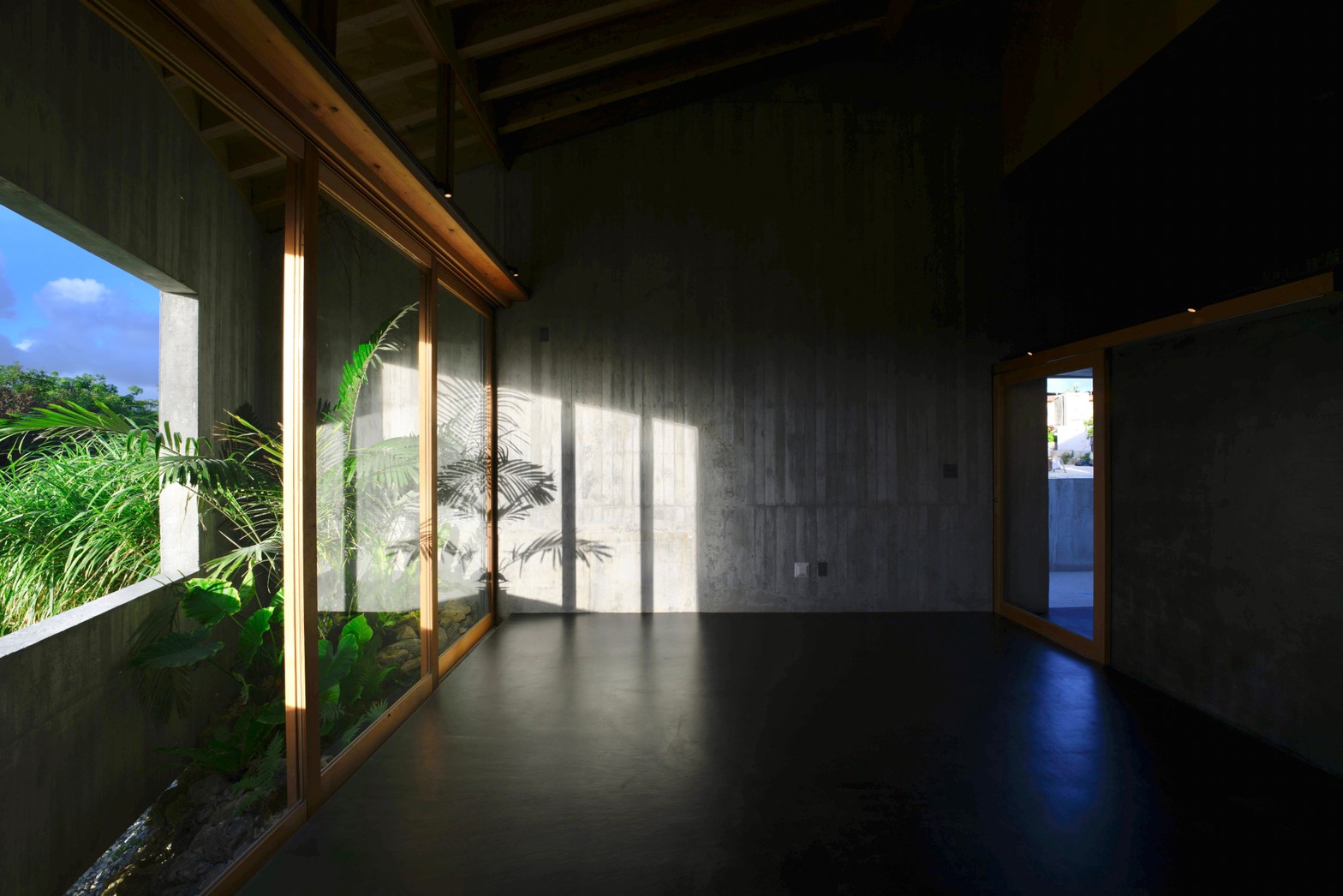 玄関から中庭を見た景色。「沖縄らしい建築」を意図し、沖縄の在来種である植物を植えている