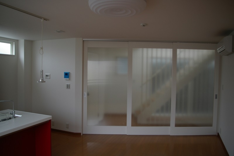 2階LDK 引き戸/LDKの出入口は開放感のある大きな引き戸。素材は半透明のポリカーボネート。引き戸は2階~3階への階段に面しているため、3階の個室へ行き来する家族の気配がわかりやすい
