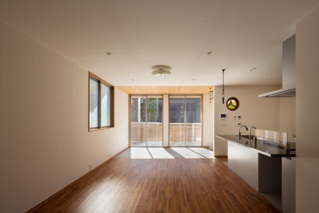 1階親世帯。庭に出る奥の窓の近辺の床は、日焼けしやすいフローリングを避け、庭の軒下に敷いたタイルと同じ素材で仕上げている。天井も庭の軒裏と同じ素材でひと続きにすることで、内と外のつながりを表現。屋外との心地よい一体感が生まれている