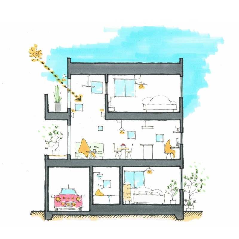 2階のリビングから吹き抜けを見上げたところ。スケッチを参考に、植物が置いてある。バルコニーは窓越しに見える植物を置くエリアと、物干のエリアに分けて使っている
