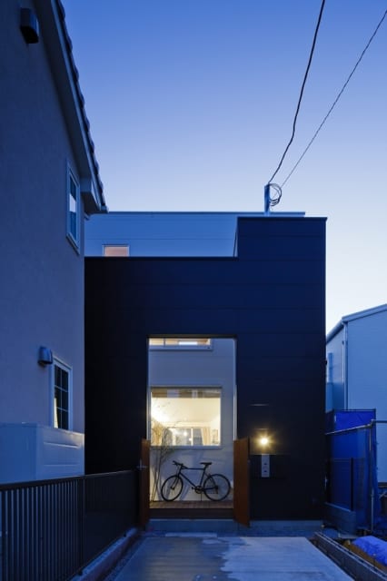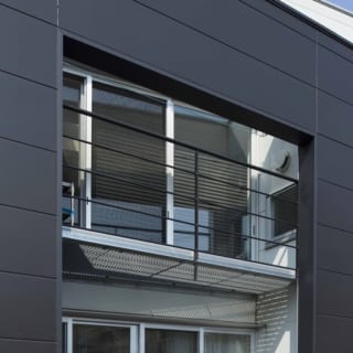 建物エントランス側の外観。玄関は1階(親世帯)と2階(子世帯)それぞれにあるが、街から見える玄関は黒い壁の一か所のみ。一世帯の一軒家のような佇まいだ。