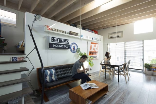 2階の子世帯のリビングルーム。現しにした天井、使い古したような風合いの床材、集めてきたインテリアが映える白い壁など、デザインとファッションが大好きなご夫妻のセンスをそのまま活かした空間に。ソファはアメリカでしか展開していない家具メーカー『トーモス・モーザー』のものを個人輸入するほどこだわった。
