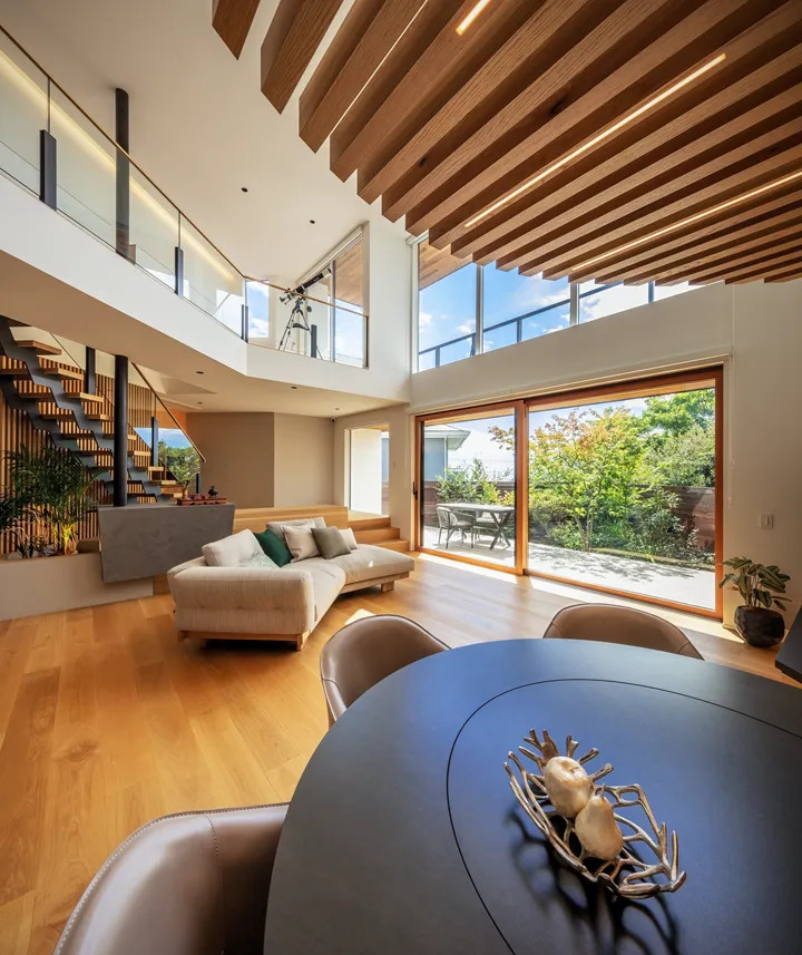 2階までの吹き抜けで、大空間のLDK。キッチンは写っていないが左に位置する。南西に大きく開口し、テラスと庭を計画。庭は公園に接しており、視線を気にせずくつろぐことができる。その上、2階にはアウトドアラウンジを計画。2階まで窓を連続させLDKの開放感を高めている