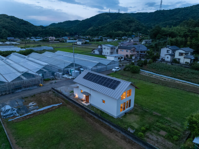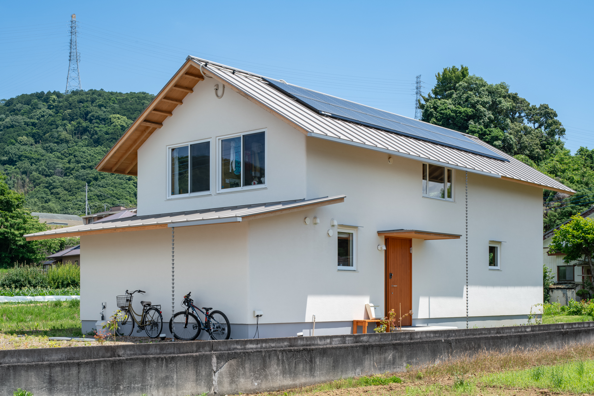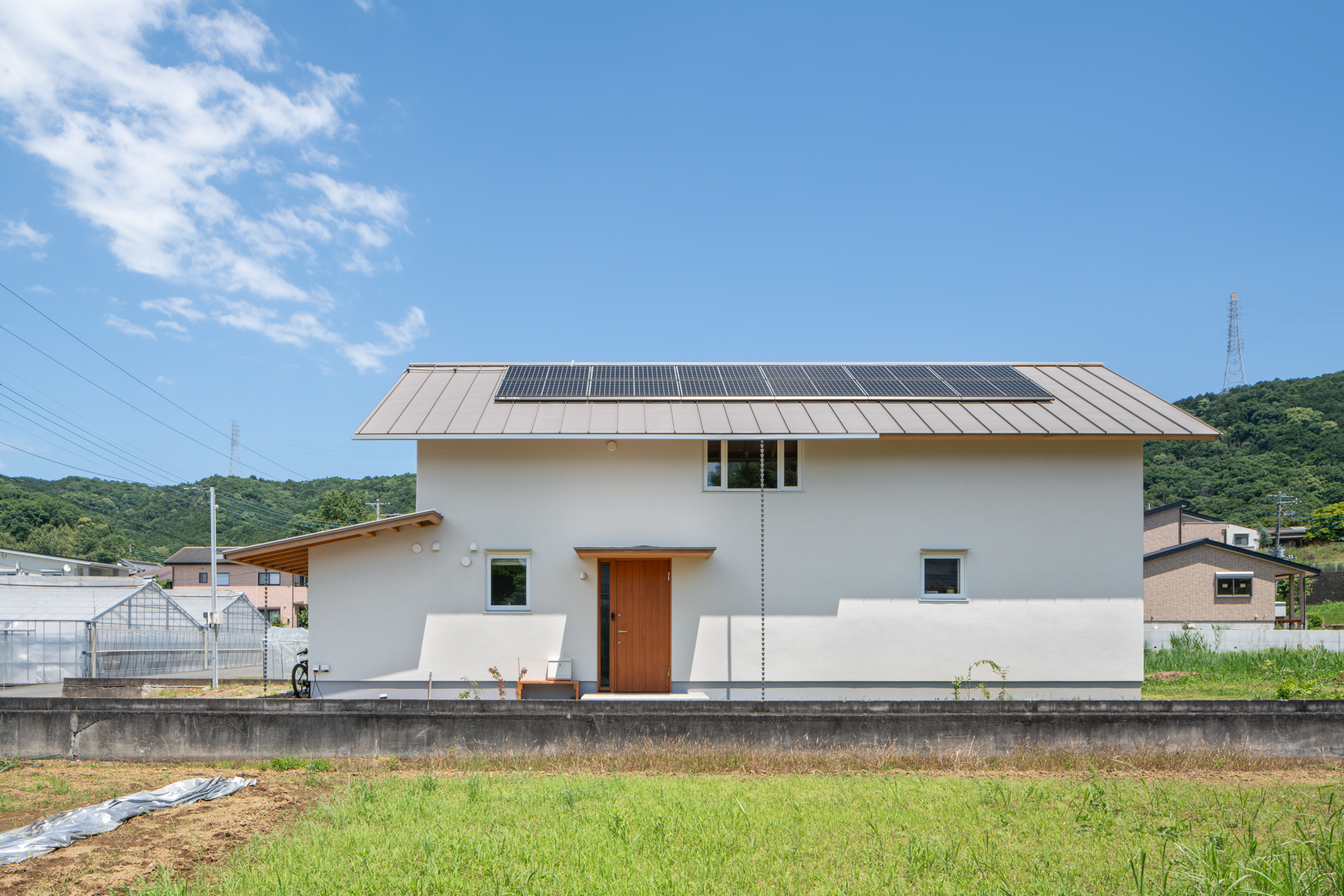 西側からの眺め。屋根の勾配は太陽光発電の発電効率と屋内空間を考慮し、6寸勾配とした。屋根の材質はガルバリウム鋼板