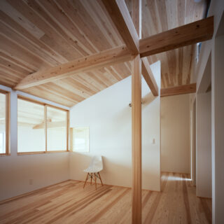 吹き抜けで広がりを感じるLDK。梁は無垢の杉。しっかりしたものなので、構造材は見えるように設計した