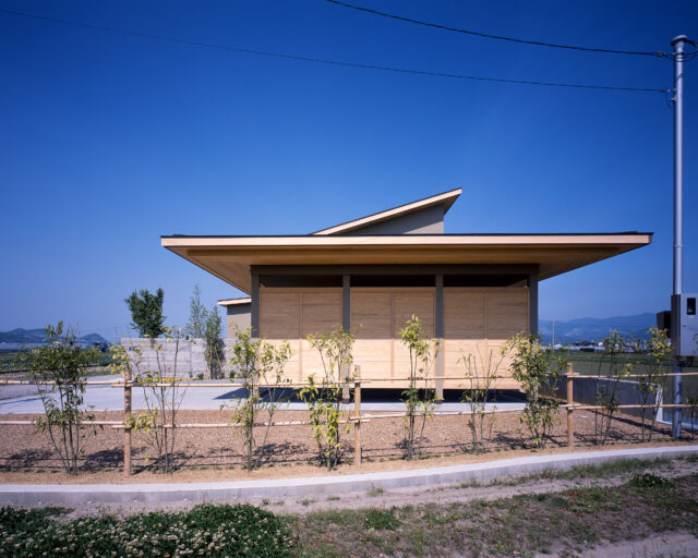 外観(正面)。畑に囲まれた立地だが、畑仕事をする人の往来があるので視線カットのために壁は高めに設置。杉板で模様をつけたコンクリート製で、周囲に威圧感がないよう配慮した