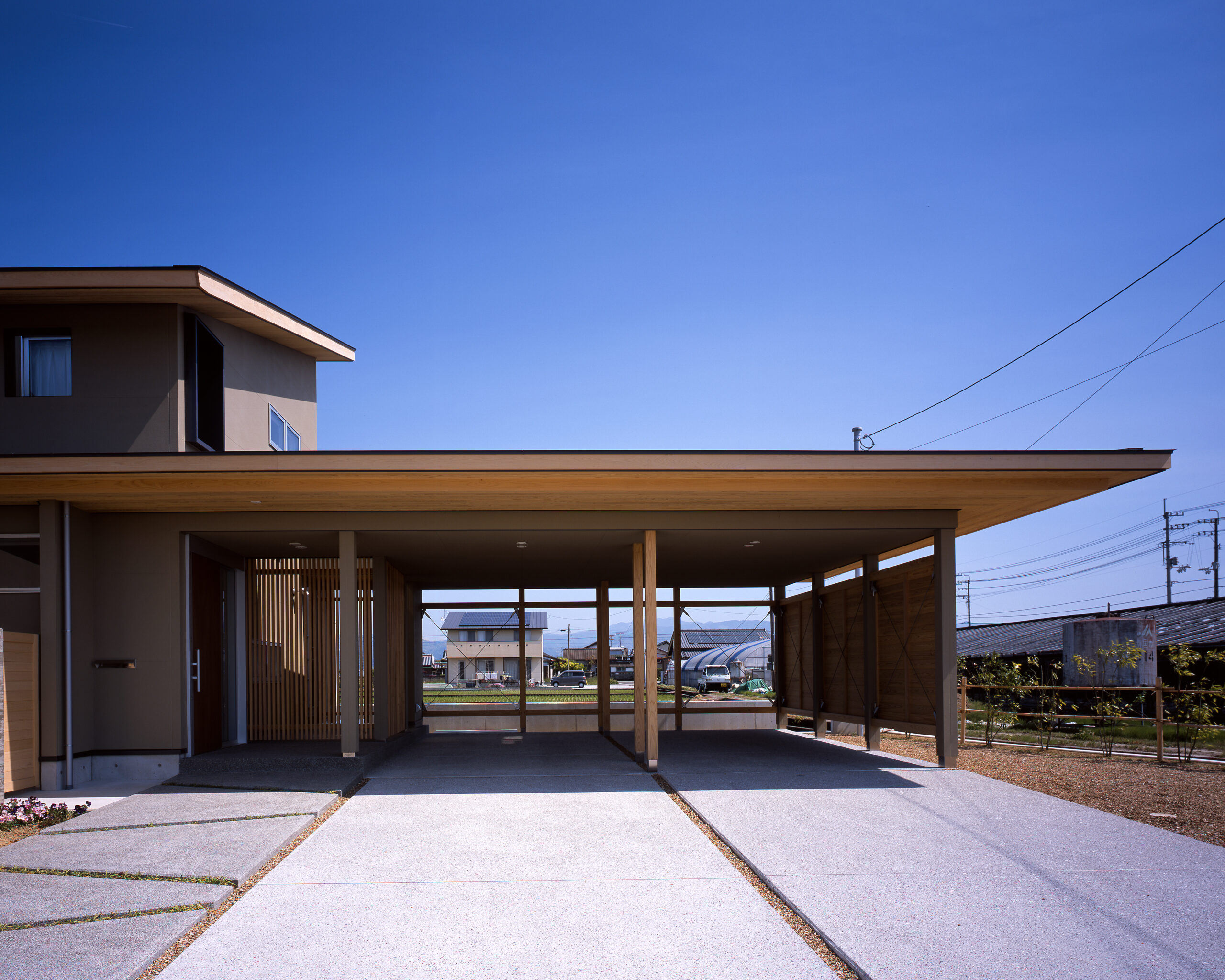 家屋と一体になった印象の、駐車場の屋根。軒も広く出ているので、雨の日に濡れることもない。2面を開放し、固定資産税がかからない工夫も施されている