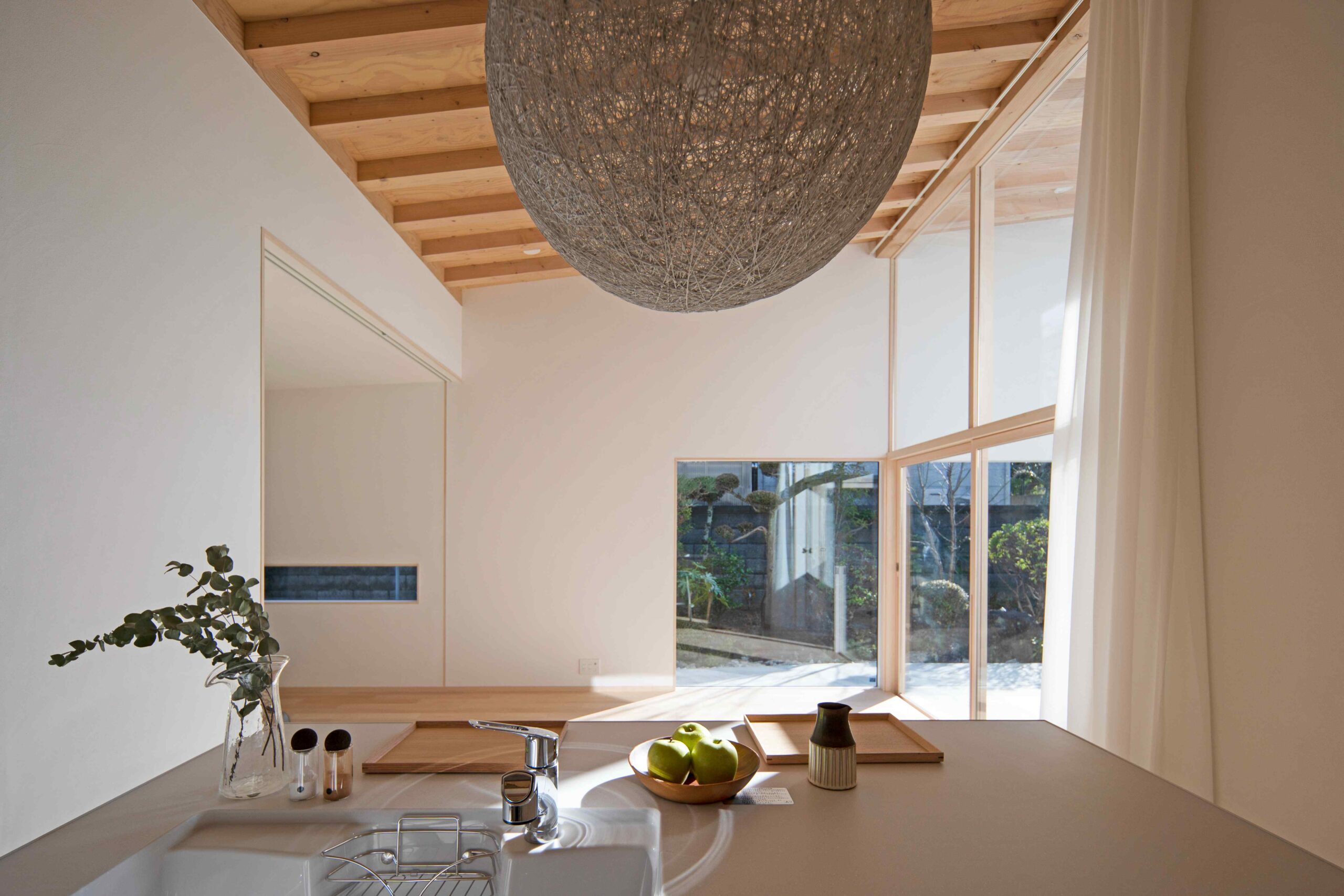 庭の景色を見ながら洗い物などができるキッチン。中土居さんが提案した繭玉のようなペンダントライトも、この部屋の雰囲気とマッチしている。