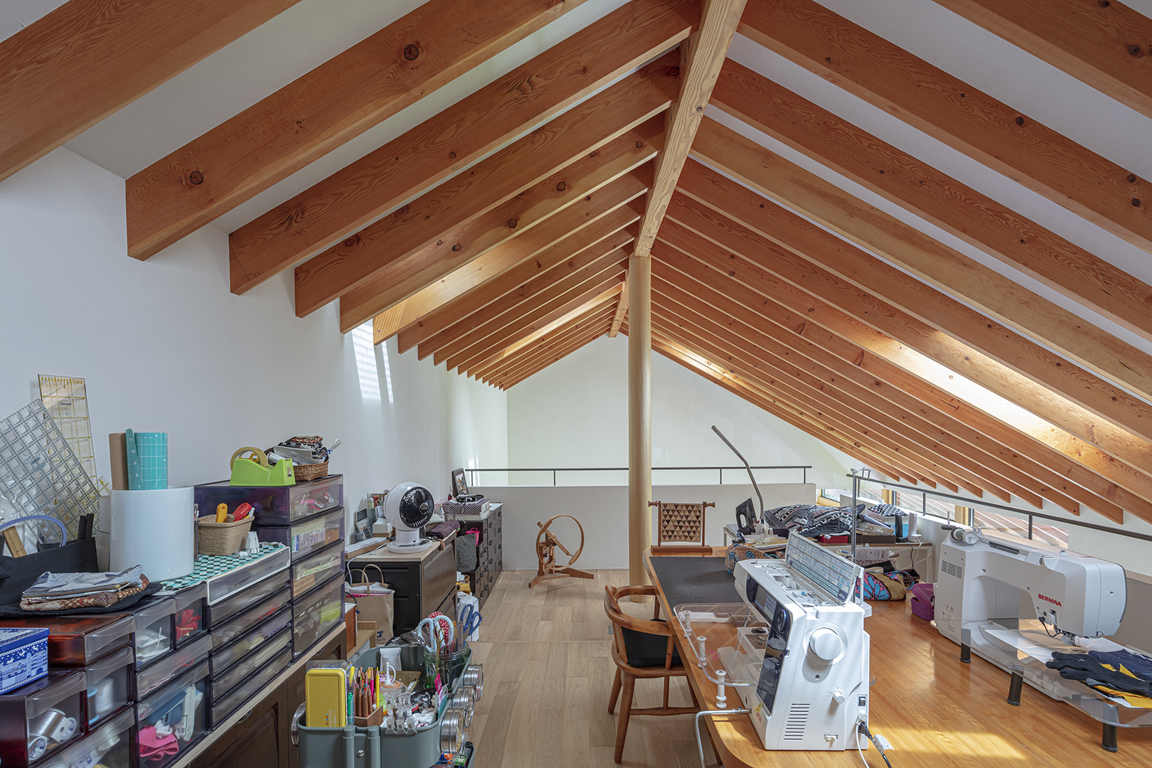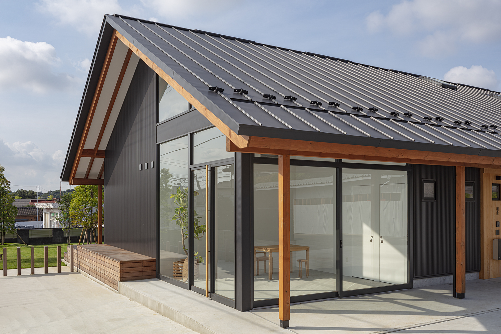 大屋根の軒天は垂木が見える現し仕上げで、木のぬくもりを感じさせる。街道側の一角は木工職人の息子さんが仕事で使うショールームとしてつくったスペース。ガラス張りのオープンでモダンなデザインが人目を引く