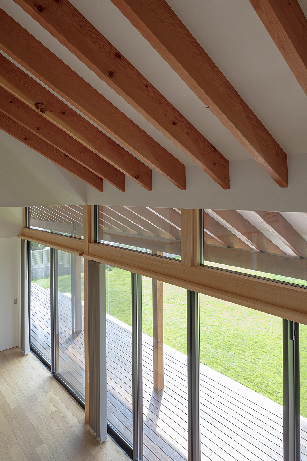 軒までのびた垂木が屋外との一体感を強調。ウッドデッキにかかる深い軒は夏の直射を遮る効果もある
