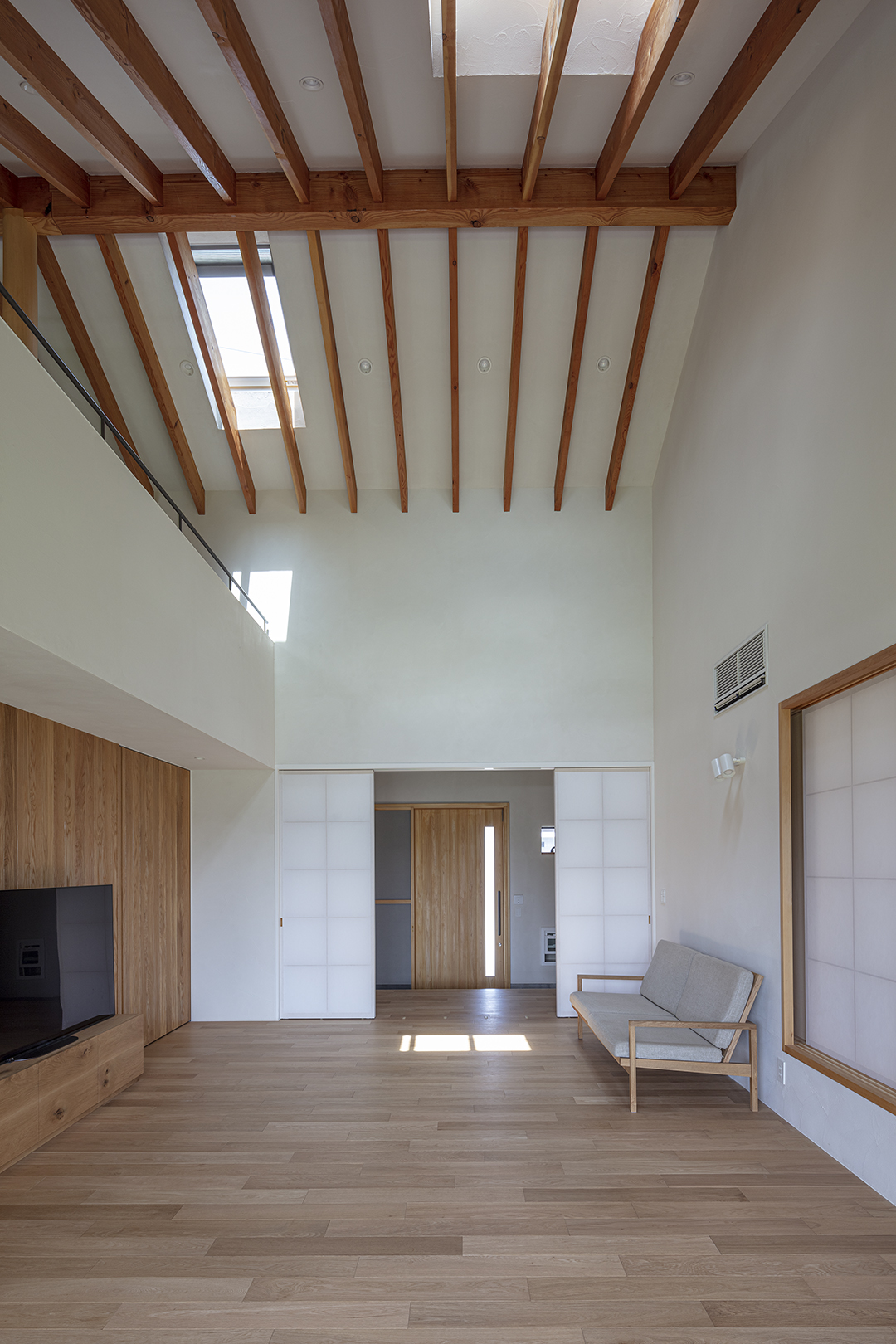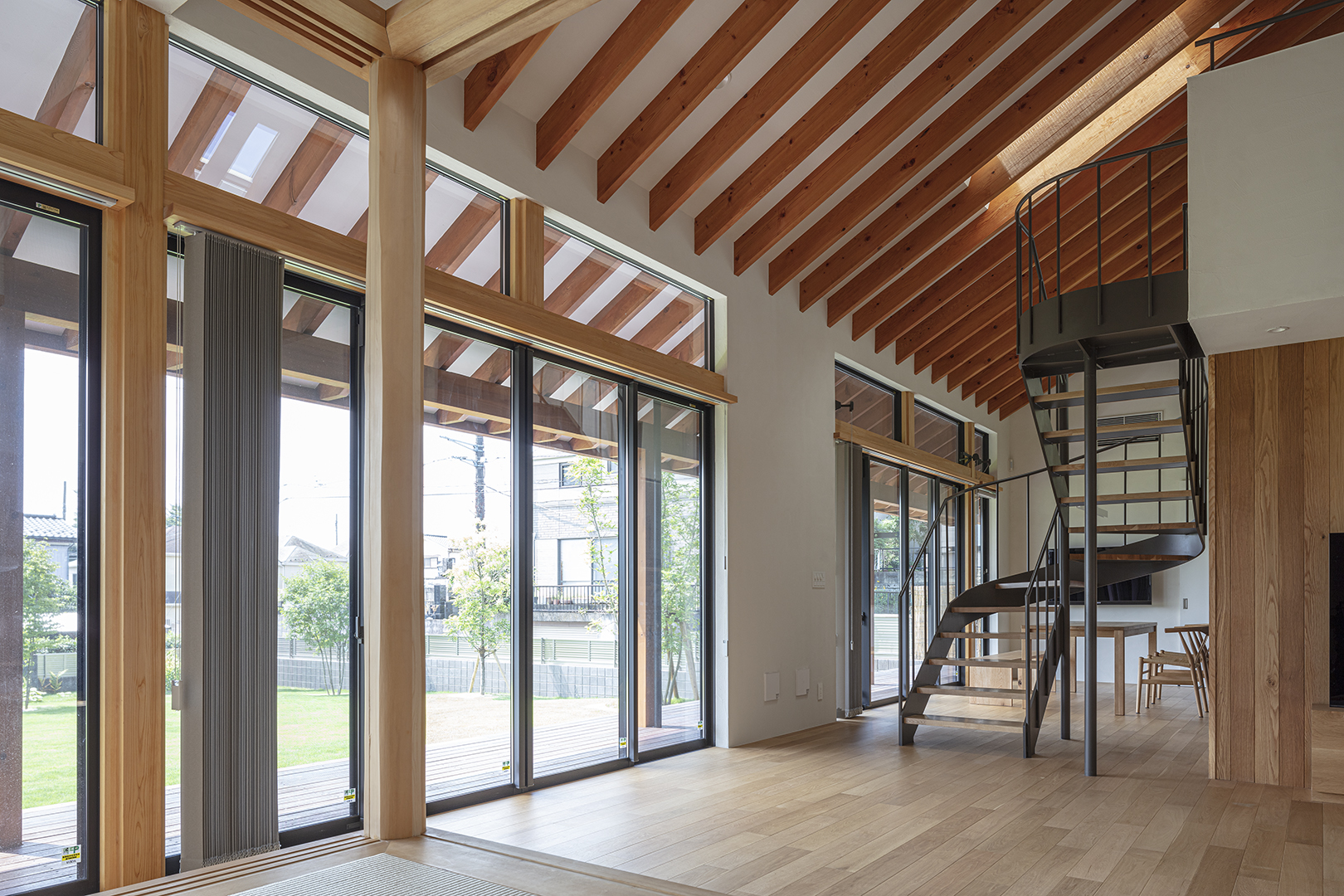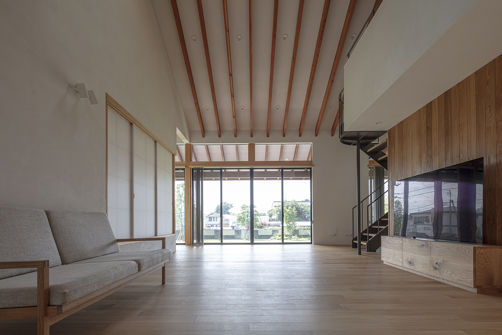 リビング。まっすぐのびた長い垂木が天井や庭に意識を向かわせ、開放感を強調する。内装は息子さんがつくった無垢材のテレビボードとのバランスを考慮し、床はナラ、天井や壁は珪藻土と漆喰のブレンドの左官塗り。木製の壁はパネルよりも厚みがあり素材感が生きるフローリング材