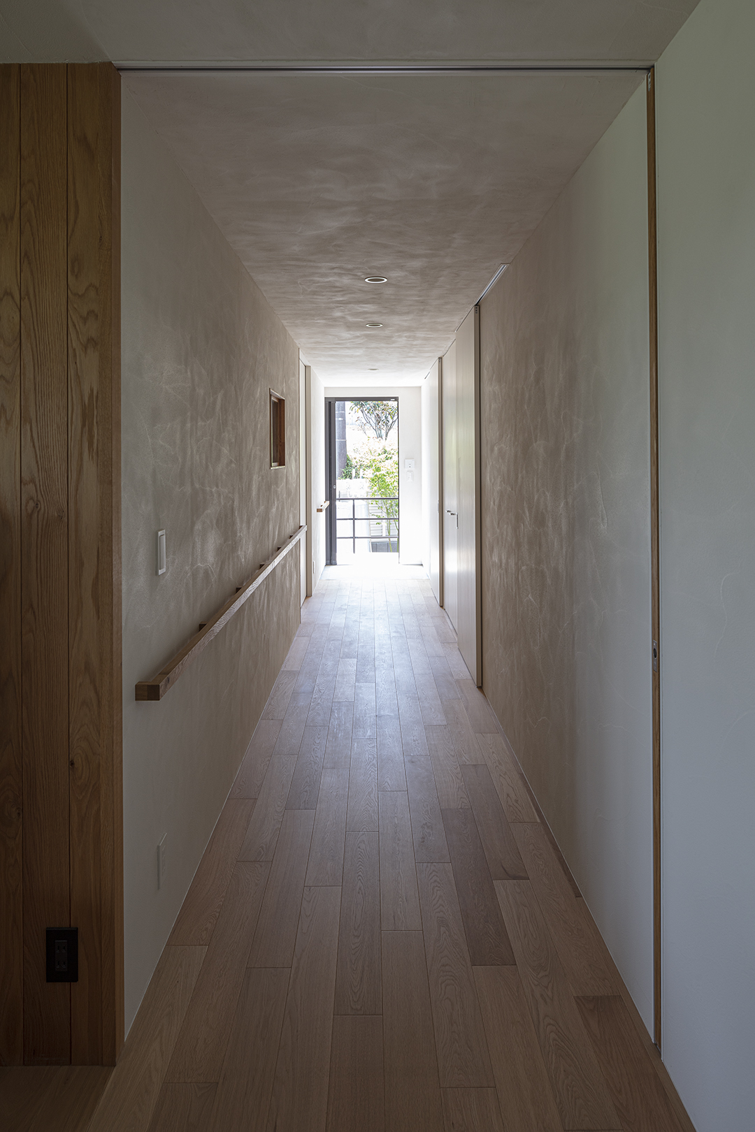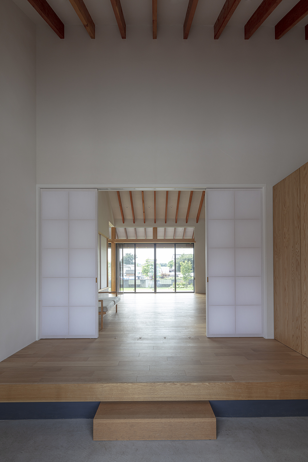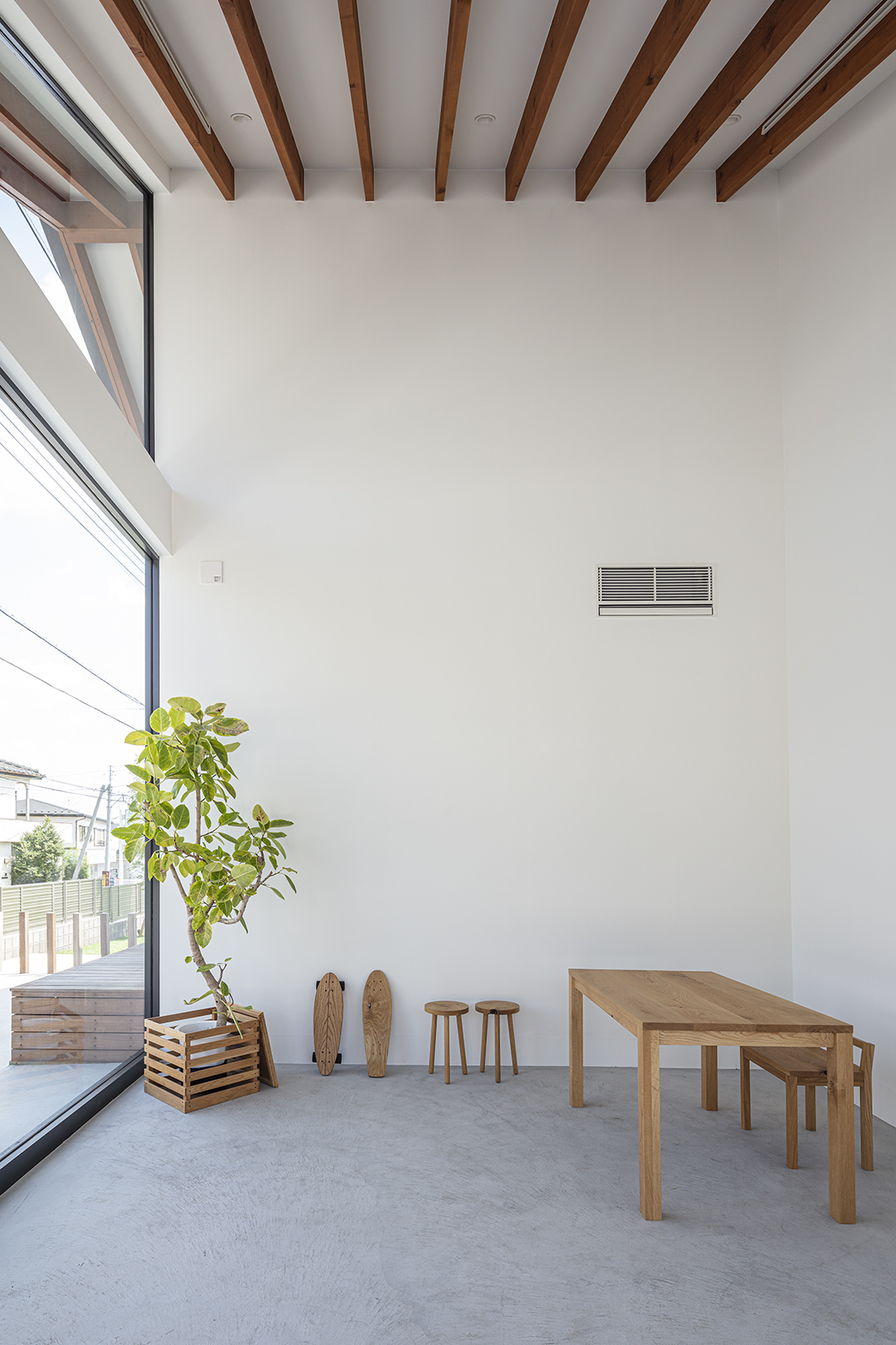 庭側から見たリビング。玄関(写真奥)から庭まで続く「通り土間のような配置」でつくられている
