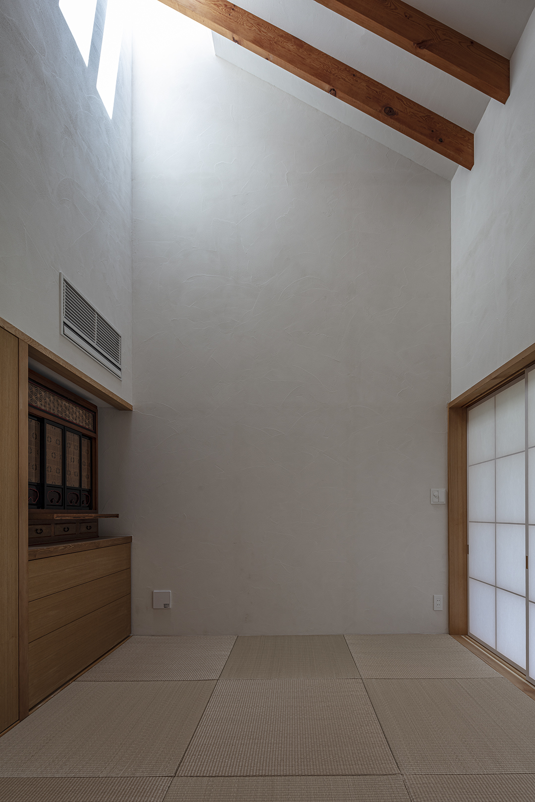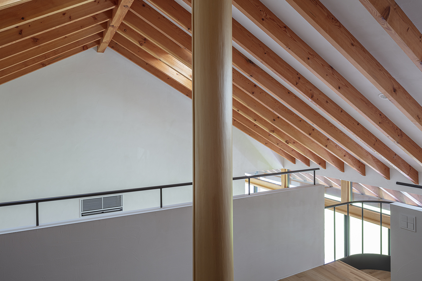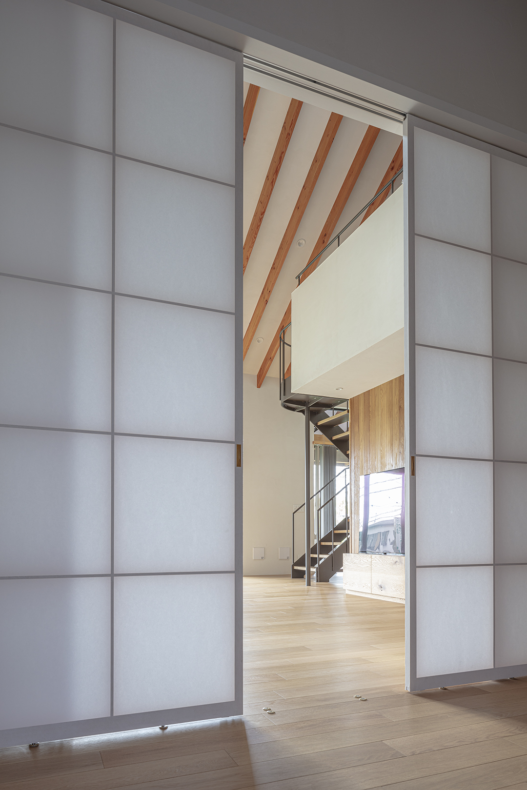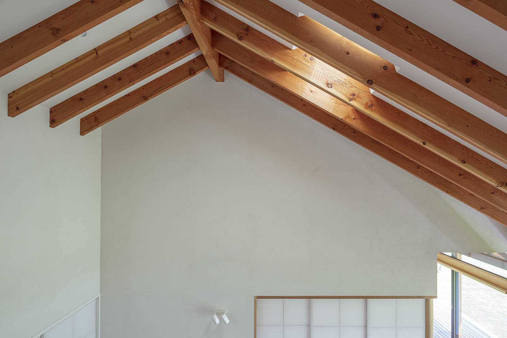 玄関ホールの先はリビング。障子戸の四角いマス、階段の曲線、垂木の斜線がグラフィカルな風景を生み出す