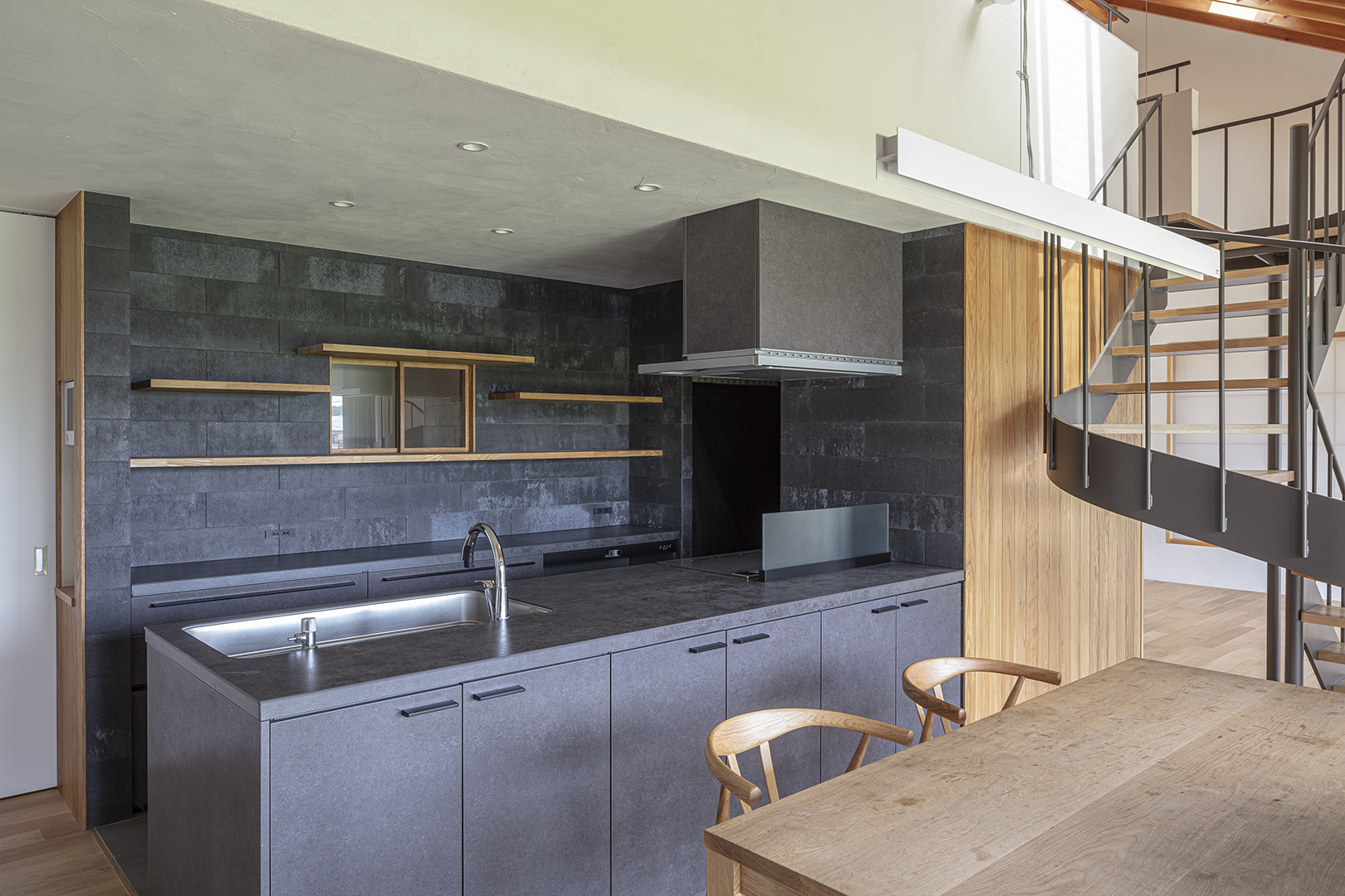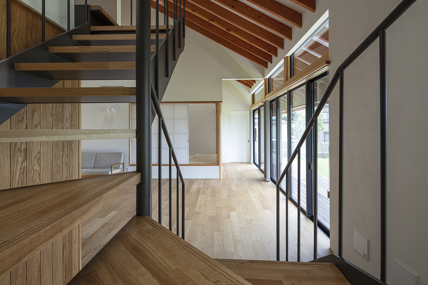 オブジェのような階段でリビング(手前)とダイニング(奥)をゾーニング。南は大きく開口し、要望の1つだった「日当たり、風通し」も実現。写真右に進むと勝手口に続く廊下や玄関があり、風が気持ちよく通る。天井には複数の天窓を設け、上からの採光や上下の風の流れも確保