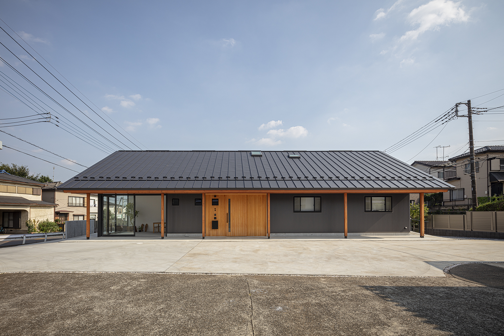 北の外観。手前のコンクリート広場は親族が集まる屋外の社交場。矢島さんがデザインした木製の玄関ドアは周囲の壁も板張りにして仕上げ、ガルバリウムの外壁とのバランスを取った。軒の木柱もアクセントとして生きていて、新年の門松なども似合う和モダンな佇まいになっている