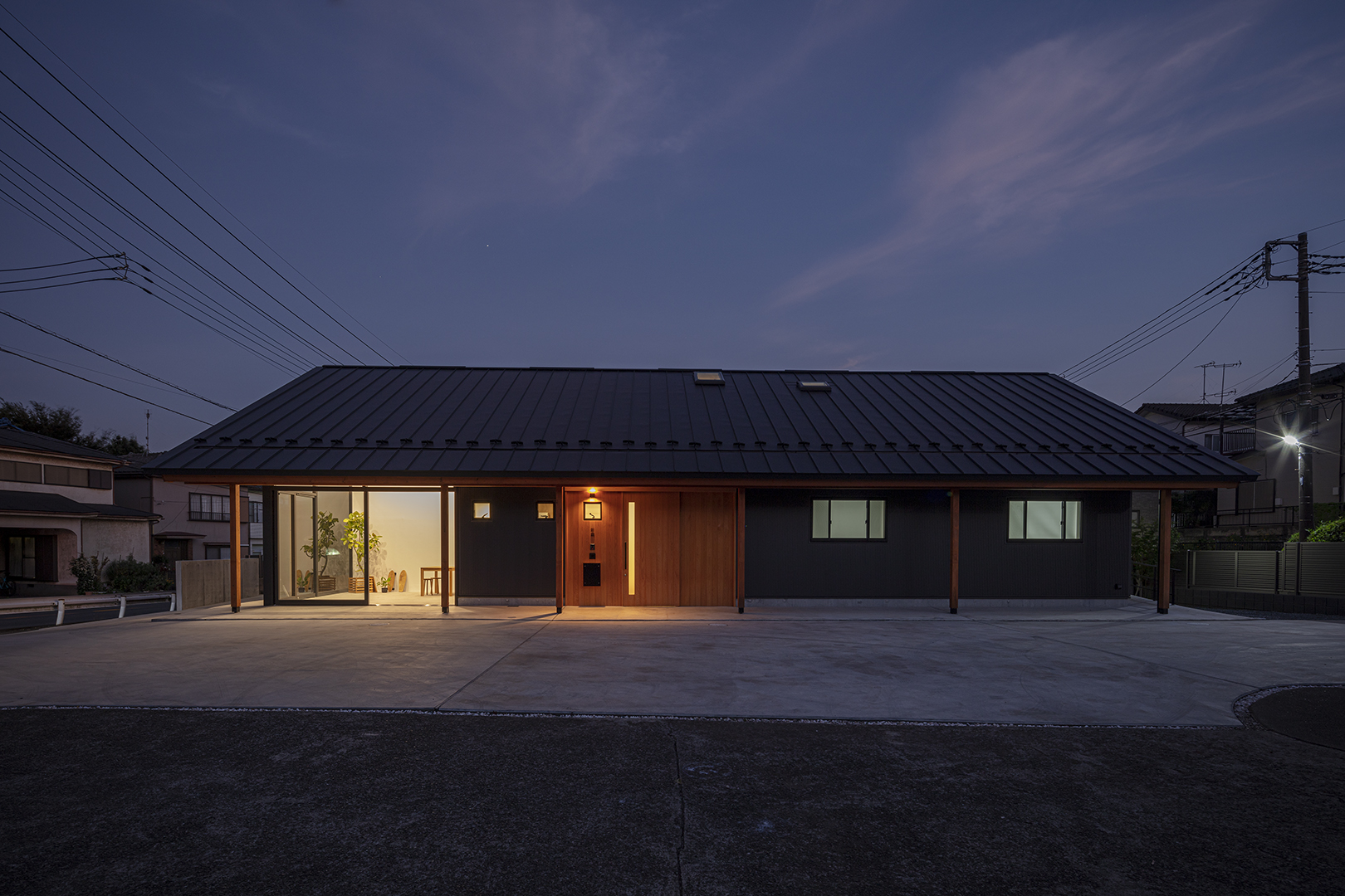 北の外観の夕景は、静かで上品な印象。「日本的な家」という要望を踏まえてしっとりとした和の風情を意識し、照明は明るくなり過ぎないように計画した