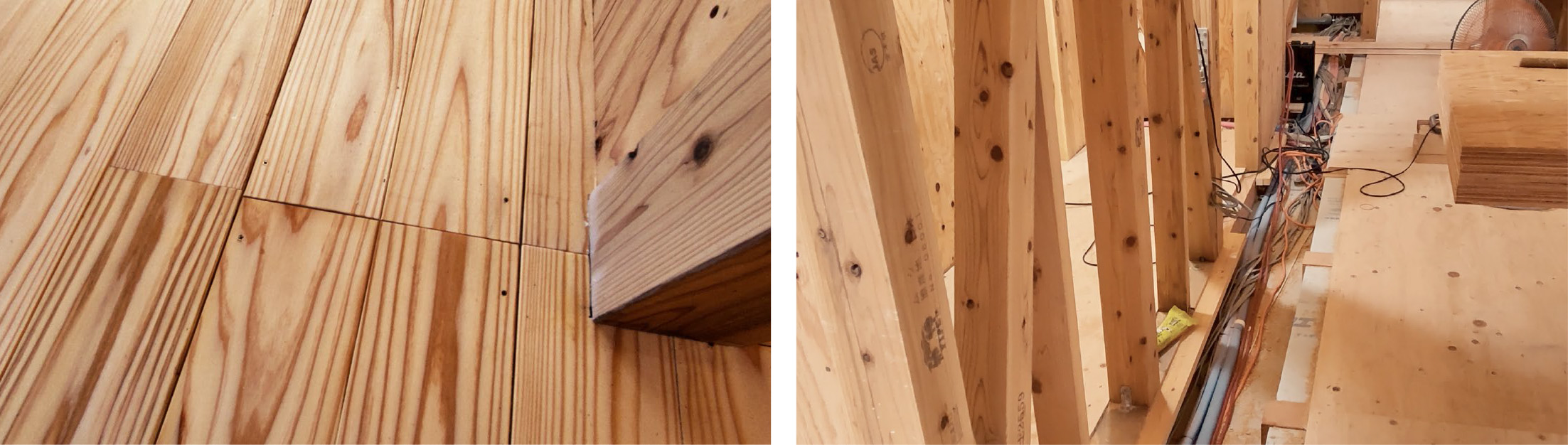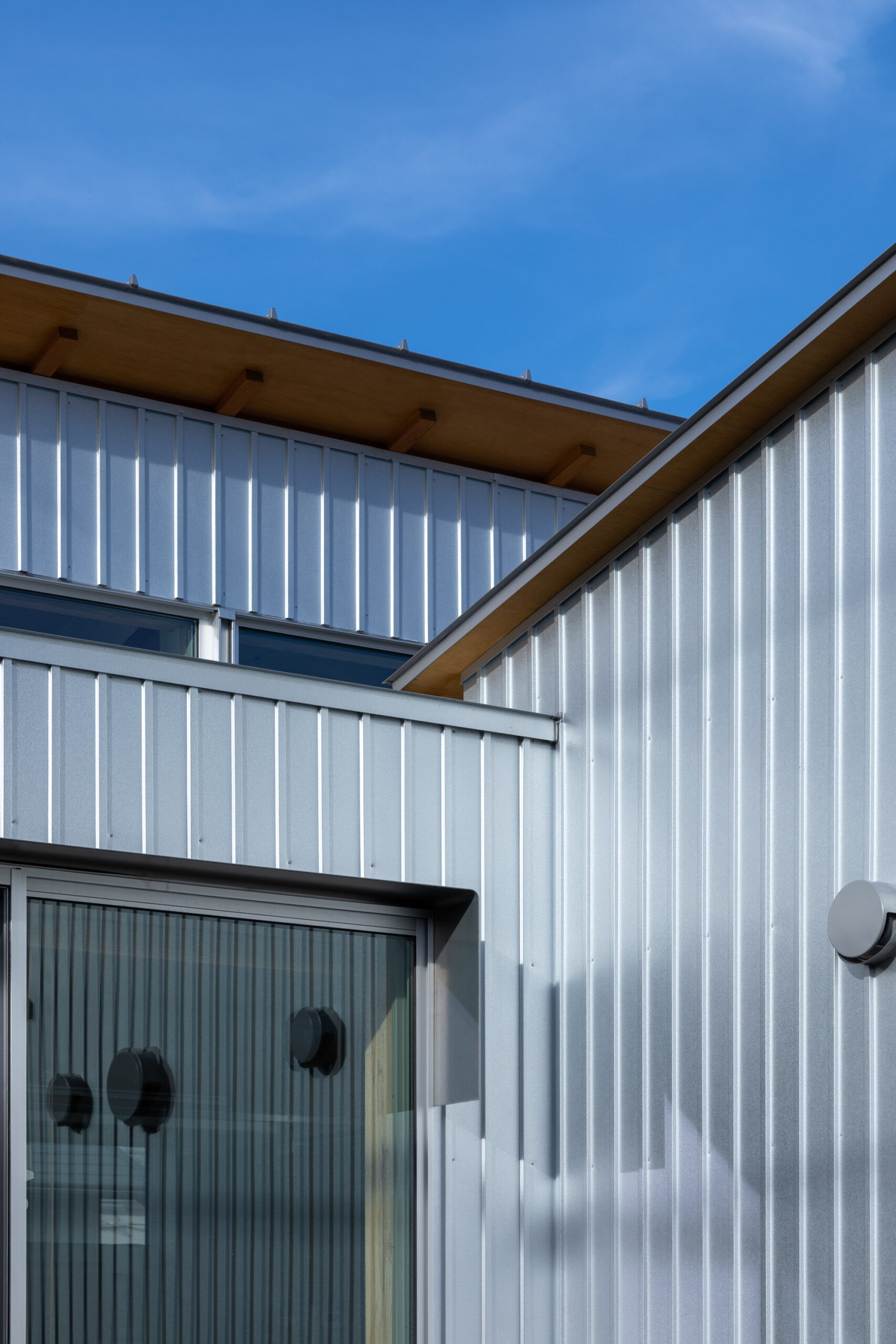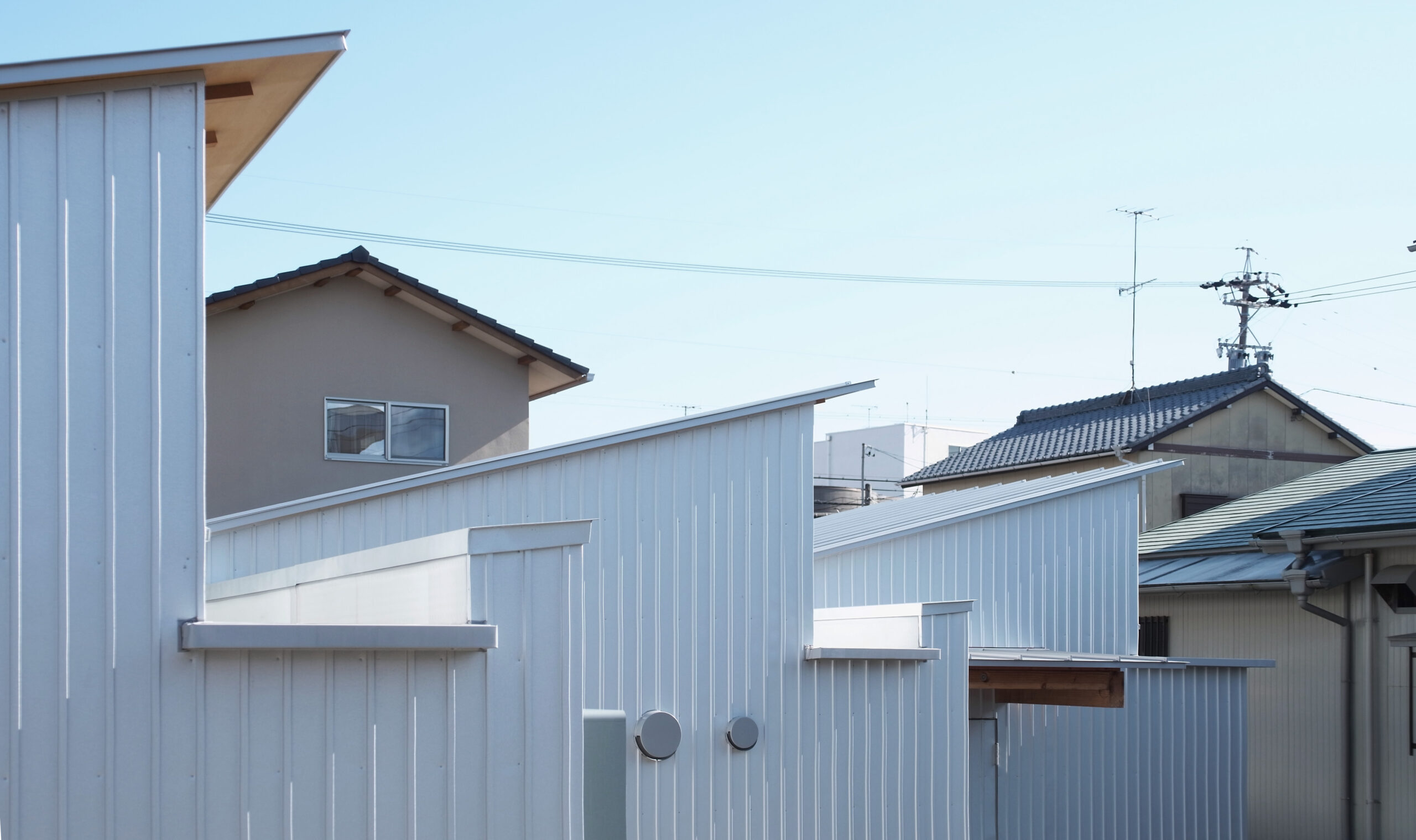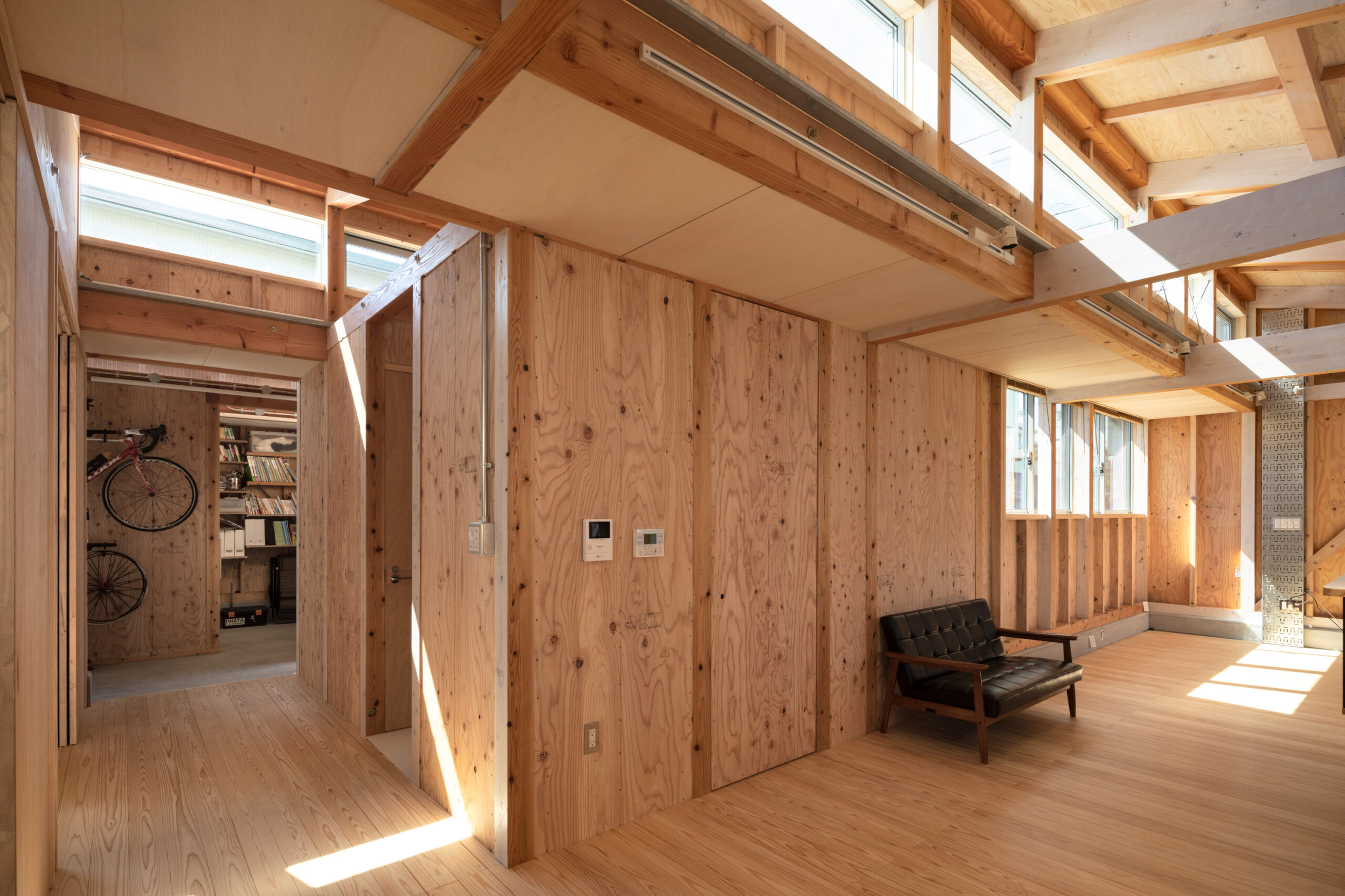 LDK。外観からは想像できないほど明るく開放的な室内。画像左の低い天井から壁を立ち上げ、ハイサイドライトを計画。豊かに日射が入る。木材の中に配管などの金属をポイント使いした設えは、日々の生活で自然に生まれた雑多な雰囲気を大らかに受け止める