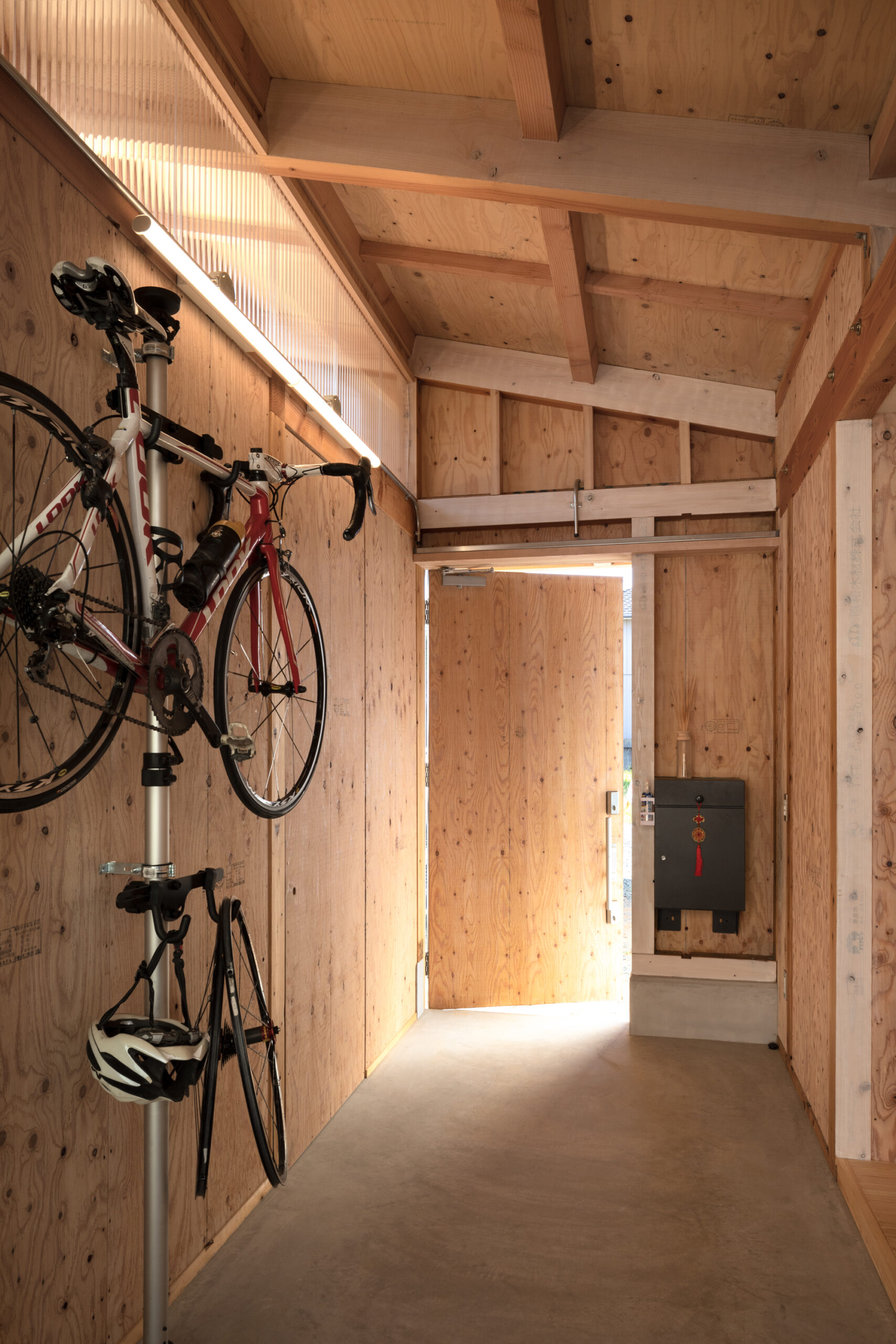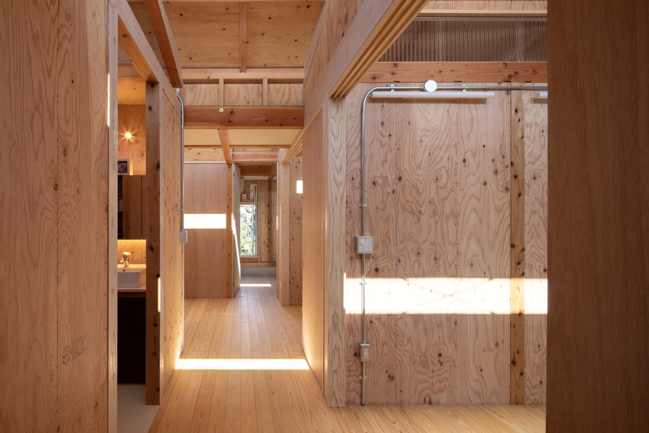 LDKから玄関方向を見る。玄関のさらに奥には土間がある。通路右壁面の仕切りは水回り。各居室と水回りの距離が保たれているかげで、将来は家としてだけでなく複数の利用主体によるシェアなど幅広い用途で改修できる。連なるハイサイドライトからは月も眺められるそう