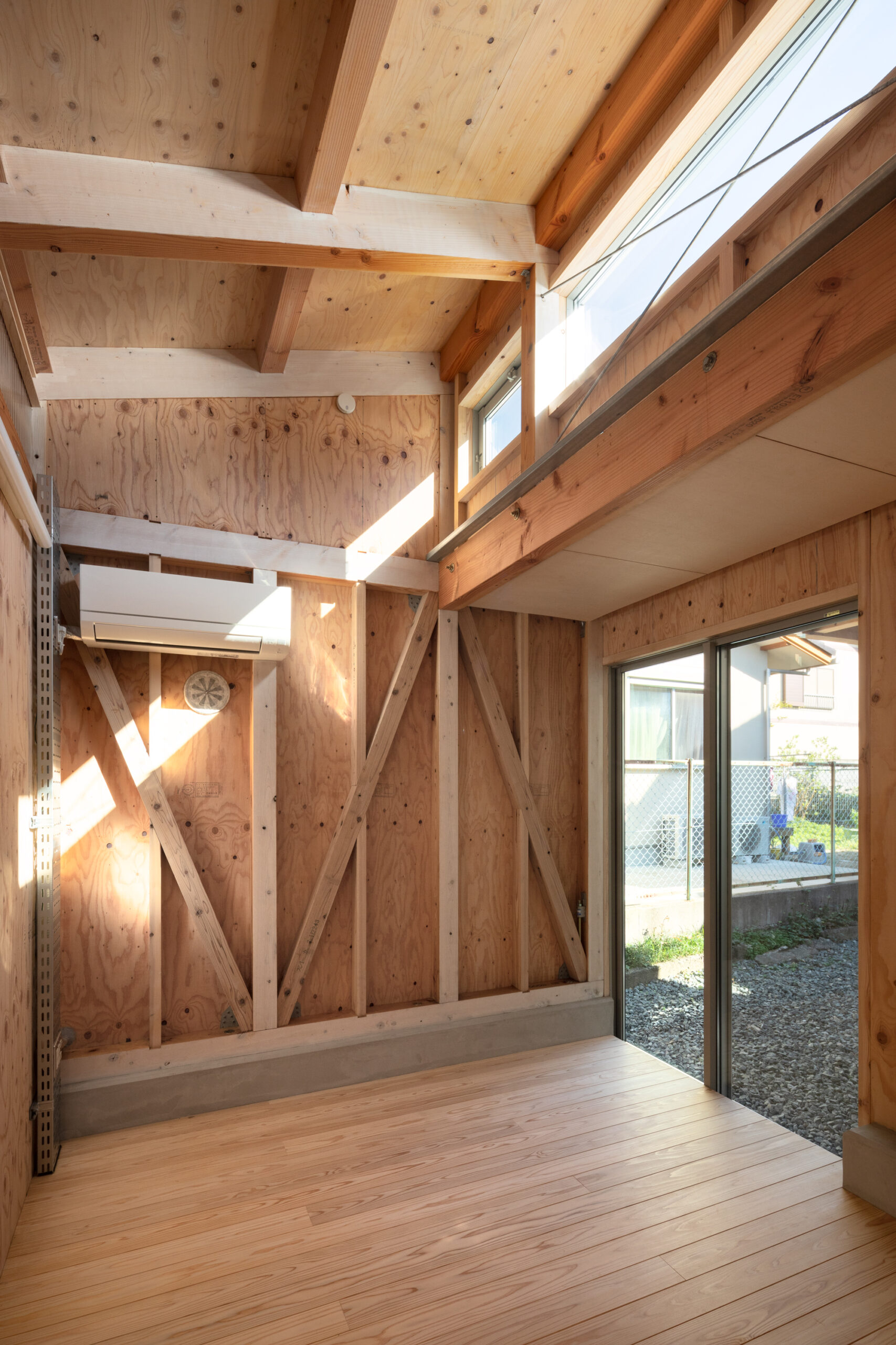 玄関から室内を見る。3つのハイサイドライトからの光がリズミカルに落ち、奥へ奥へと意識をいざなう。最奥に窓を設けたおかげで、より奥行きが感じられるようになった。柱や梁、合板耐力壁など構造体表しの室内。シルバーの無機質な配管が空間の印象に変化を与える