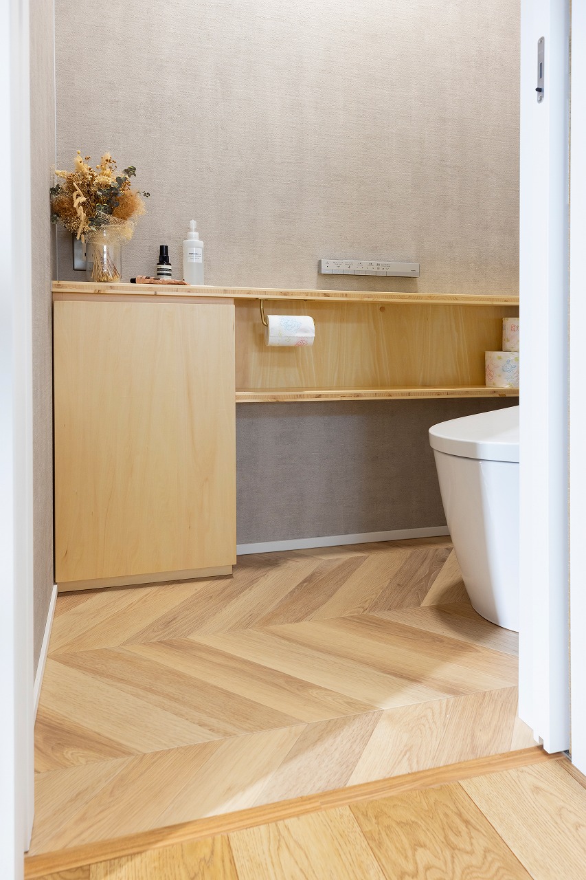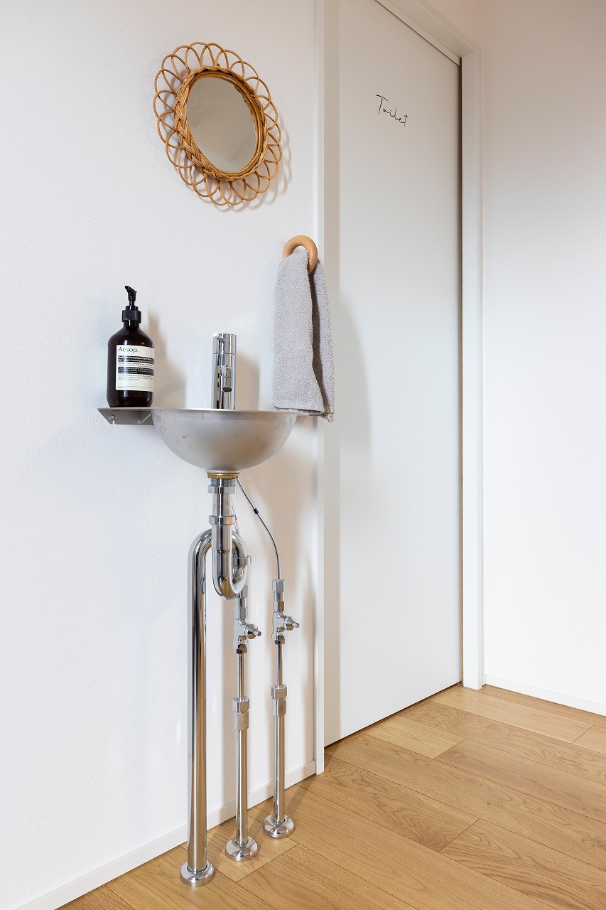 1階、玄関脇に設けた手洗い。小物の選び方に奥さまのセンスが光る