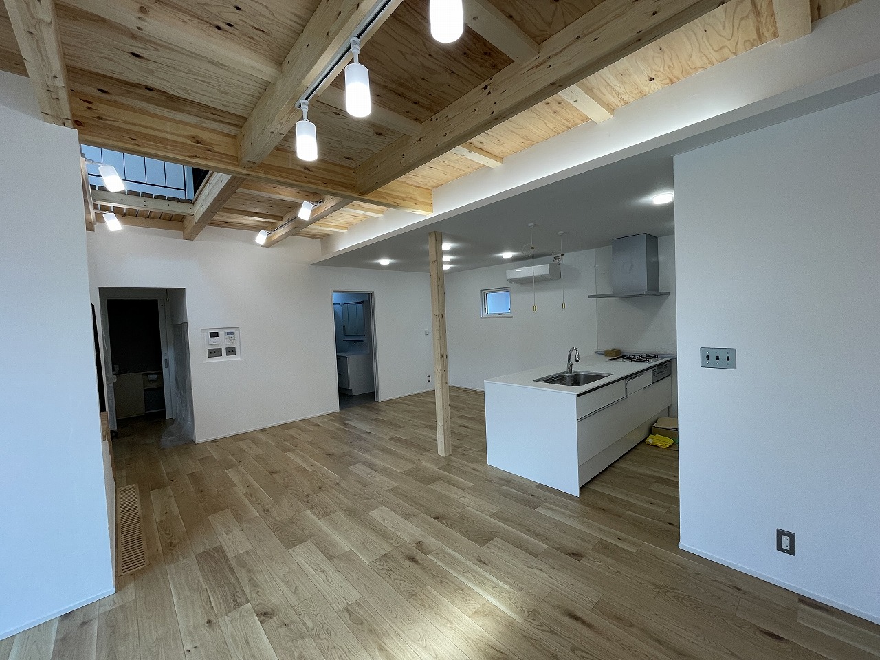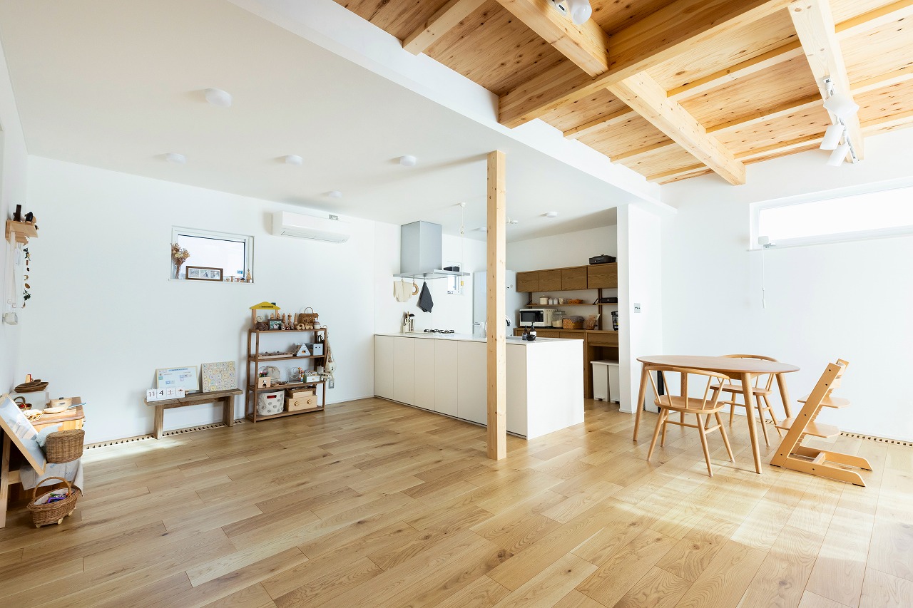1階LDK。2階部分があるリビングエリアは構造材を表しにした天井を取り入れ、天井を高くとの要望を叶えた。キッチンはペニンシュラ型を採用、キッチントップをフラットにすることでLDK全体の見通しがよくなった。円滑なコミュニケーションに役立つ